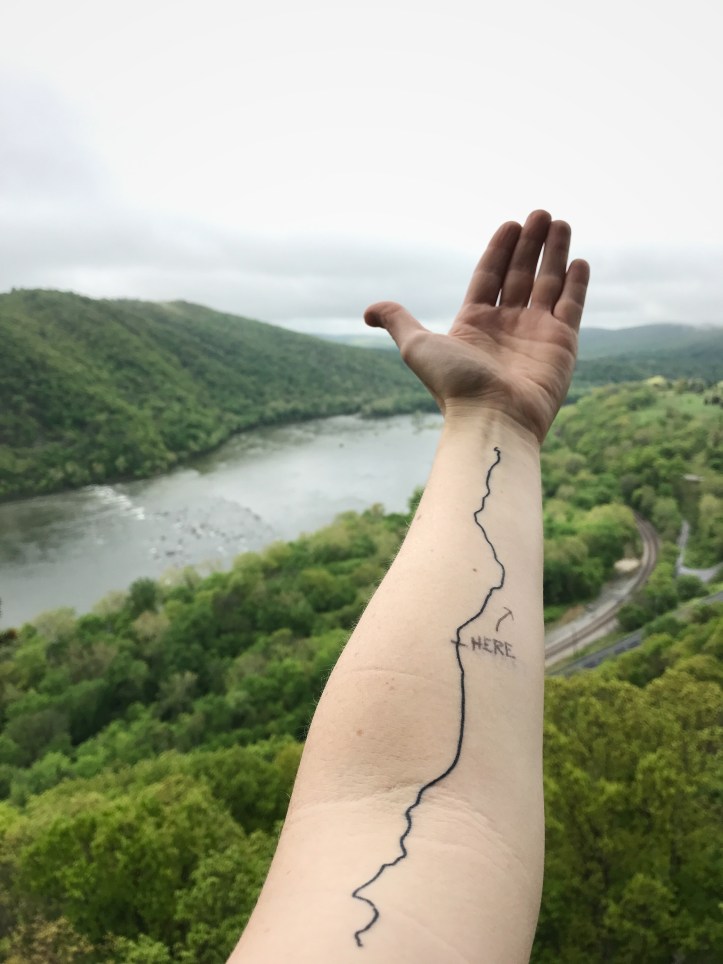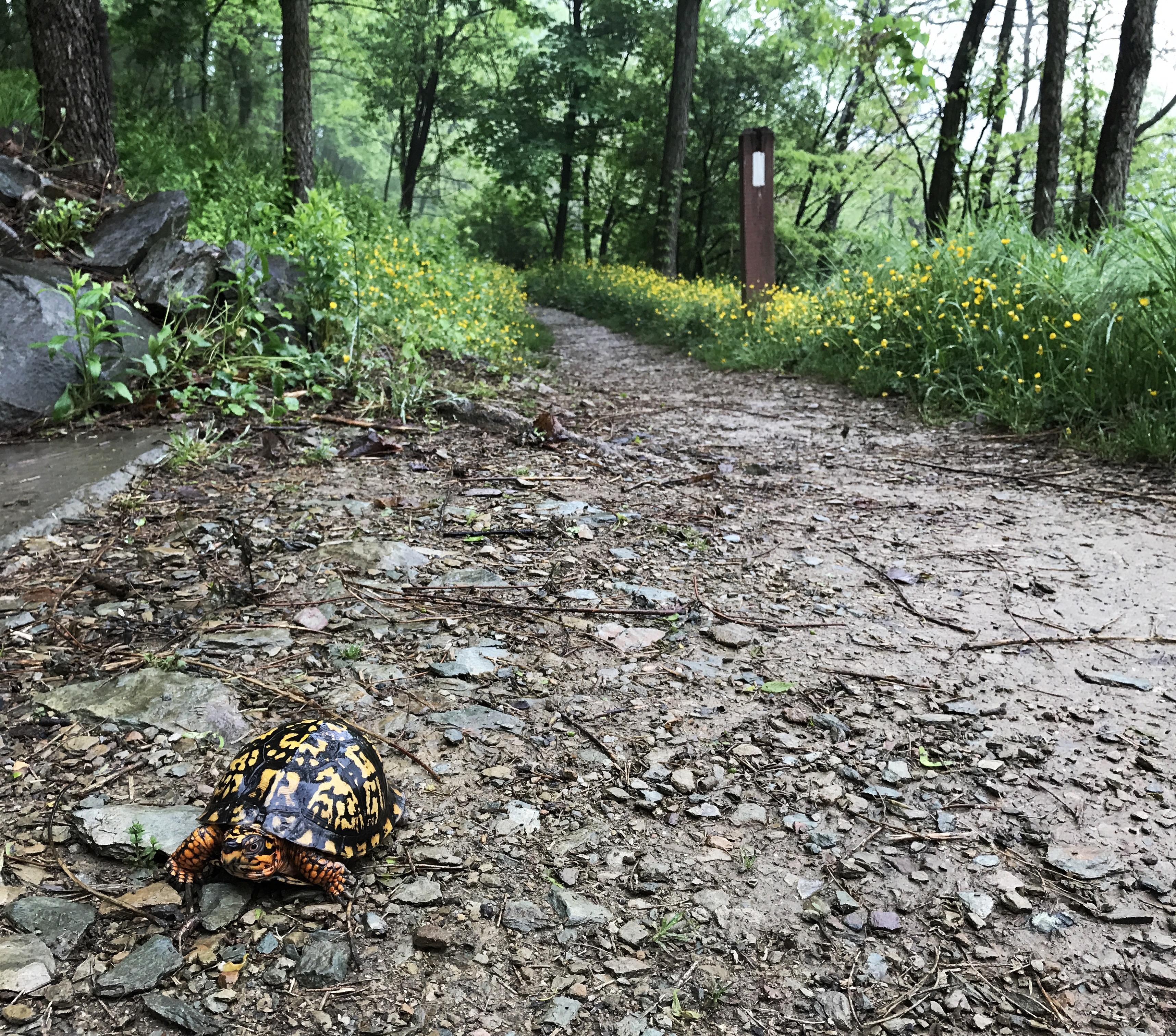 Getting back to the trail involved and mildly annoying road walk made better by an explosion of spring with dogwood, lilacs, and all other usual suspects in full bloom. The trail from the Shenandoah side of harpers ferry over to the railroad towpath involved hugging the edge of an overgrown hill and picking my way across slick rocks. Most people probably don’t think twice about them, but I’m paranoid about falling and reinjuring my tailbone. I met this little guy while I was still waking up and feeling whiny about the wet rocks.