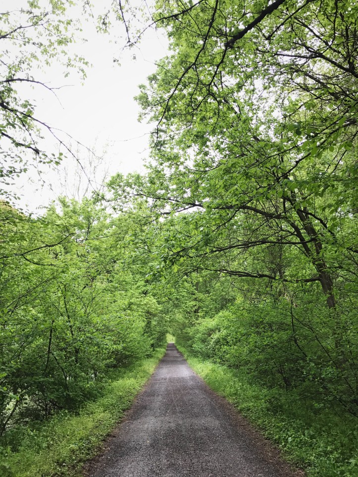 I had this view for about two hours, and I amused myself by taking dozens of flower pictures and watching birds flit across the path. There was a pretty steady racket from crows with the occasional streaking cardinal and what I imagine were migrating warblers. Also caught a glimpse of a couple of woodpeckers. Wish I knew more bird names. I relished the flat surface adter all of the rocks from yesterday, but flat is hard on my body in a different way because of the pounding. When I wasn’t taking pictures of flowers, I pretended that my hiking poles were oars pulling me forward along the flat path.