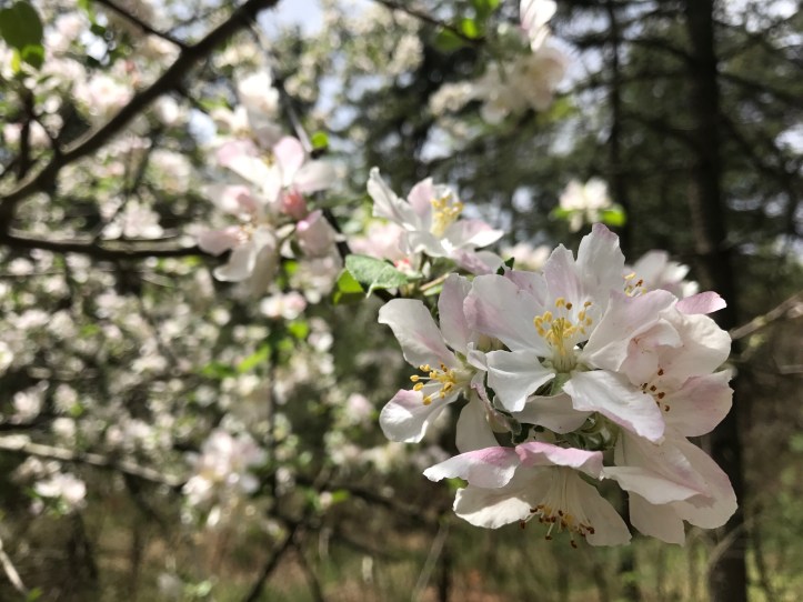 Today was pretty dull in terms of terrain with a few highlights, such as the huckleberry bushes and rhododendron lining much of the trail, a dense patch of spruce trees we walked through (top picture is part of that section) and passing a beautiful apple tree (that smelled so good) growing next to a random chimney by a road crossing.