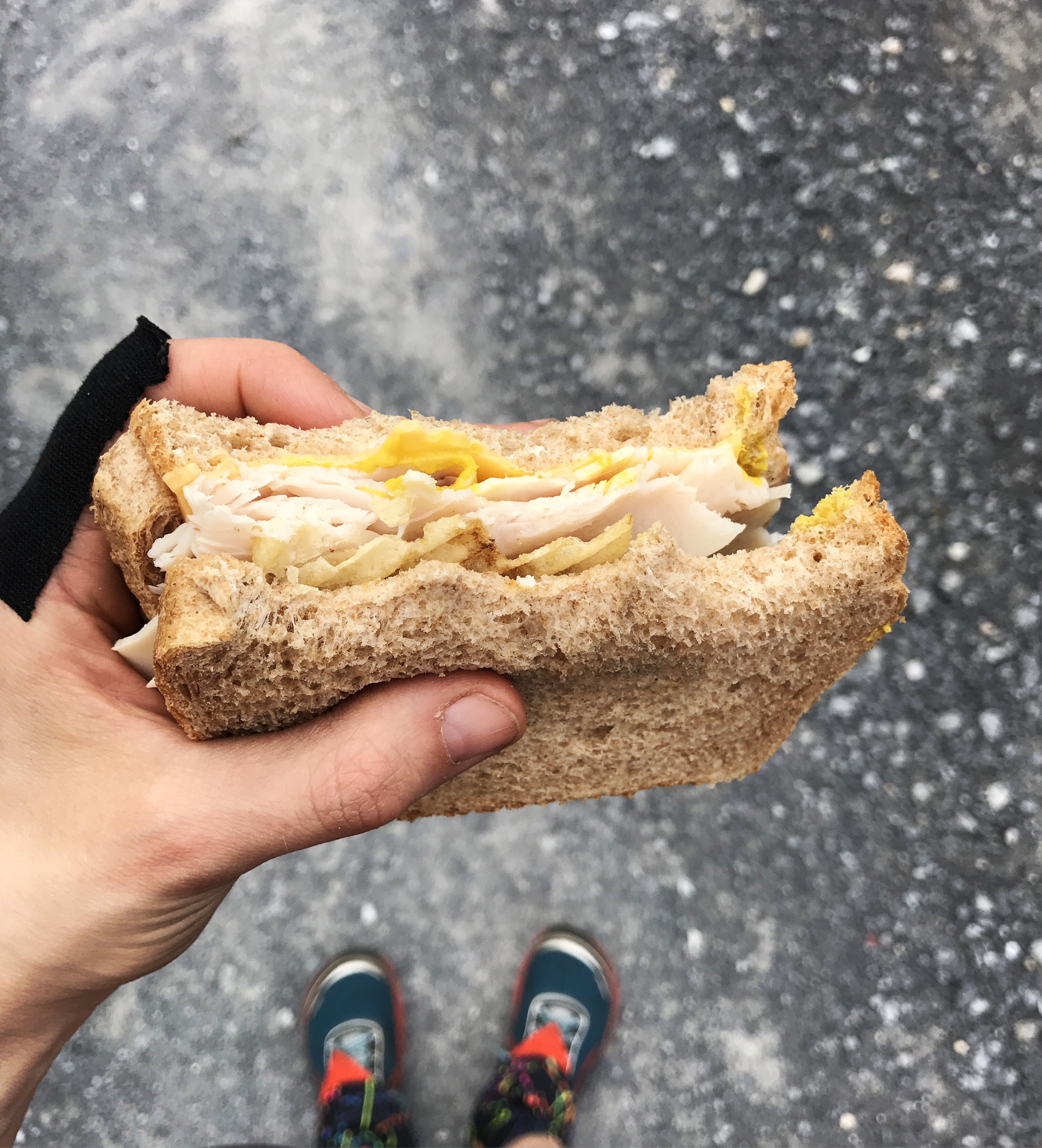 The majority of the group stopped at birch run shelter for lunch. It’s right on the trail and has bunk beds and a great little stream right next to it. Then the after lunch 5 mile push to get to toms run. With about a mile to go, I heard laughter in the distance and popped out onto a road crossing where splitter, who is a friend of moss’s, brought us trail magic. Sandwich fixings, chips, beer, and soda. I have been avoiding the beer because it messes with my joints and makes me stiff, but i drank an orange Fanta and it was like a time warp back to blazing summer softball games. So good. I wasn’t hungry, but you don’t really pass up food on the trail, so I made myself a classy sandwich of turkey, American cheese, lays chips, and mustard/mayo.