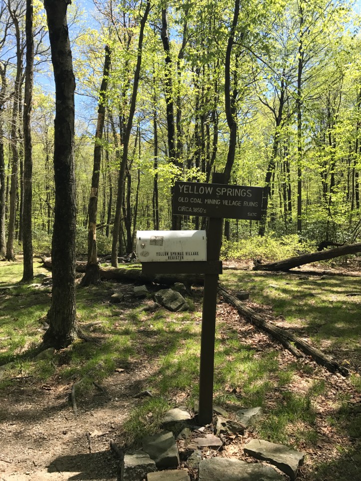 Much of the second half of today’s trail had rhododendron. I’m sad they aren’t blooming yet, and I hope I haven’t somehow timed my hike to be too early for all of my favorite forest flowers. I lost my phone signal right as I hit the stream and didn’t get it back until Chrissy and I stopped for lunch at the campground that used to be an old coal miner settlement. Or it has a trail that leads to the settlement? I’m not sure, but it has this mailbox with the trail register in it.