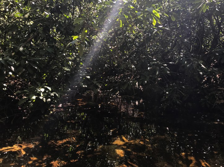 The little stream had a hearty patch of rhododendron alongside it and I felt like I was in the jungle while I sat on a rock and squeezed that infernal water bag over and over again.