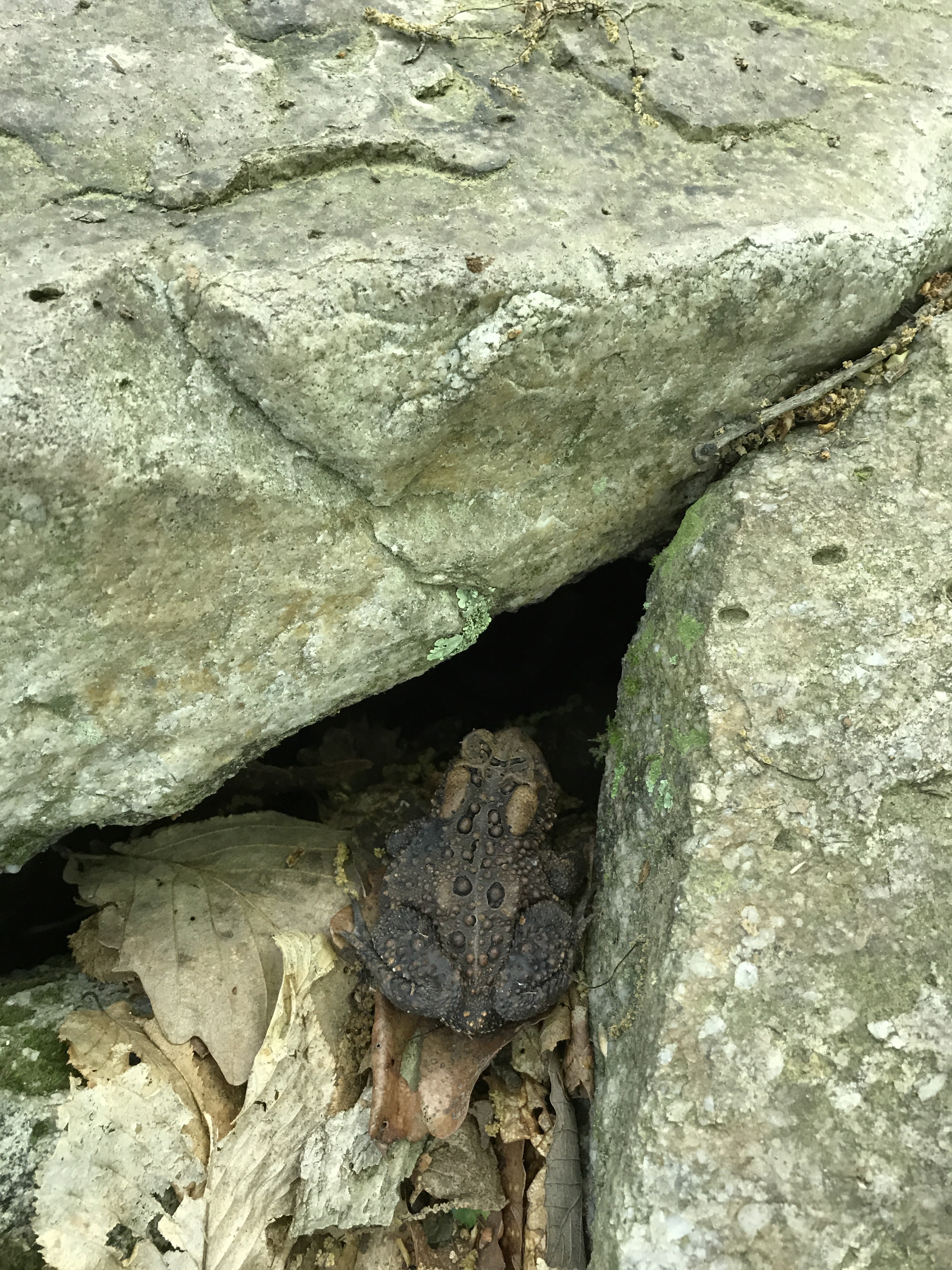 The woods over the next mile or so were filtered with morning light and birdsong. There were probably a dozen little stream crossings making for a nice walk. Also saw this little guy between two rocks.