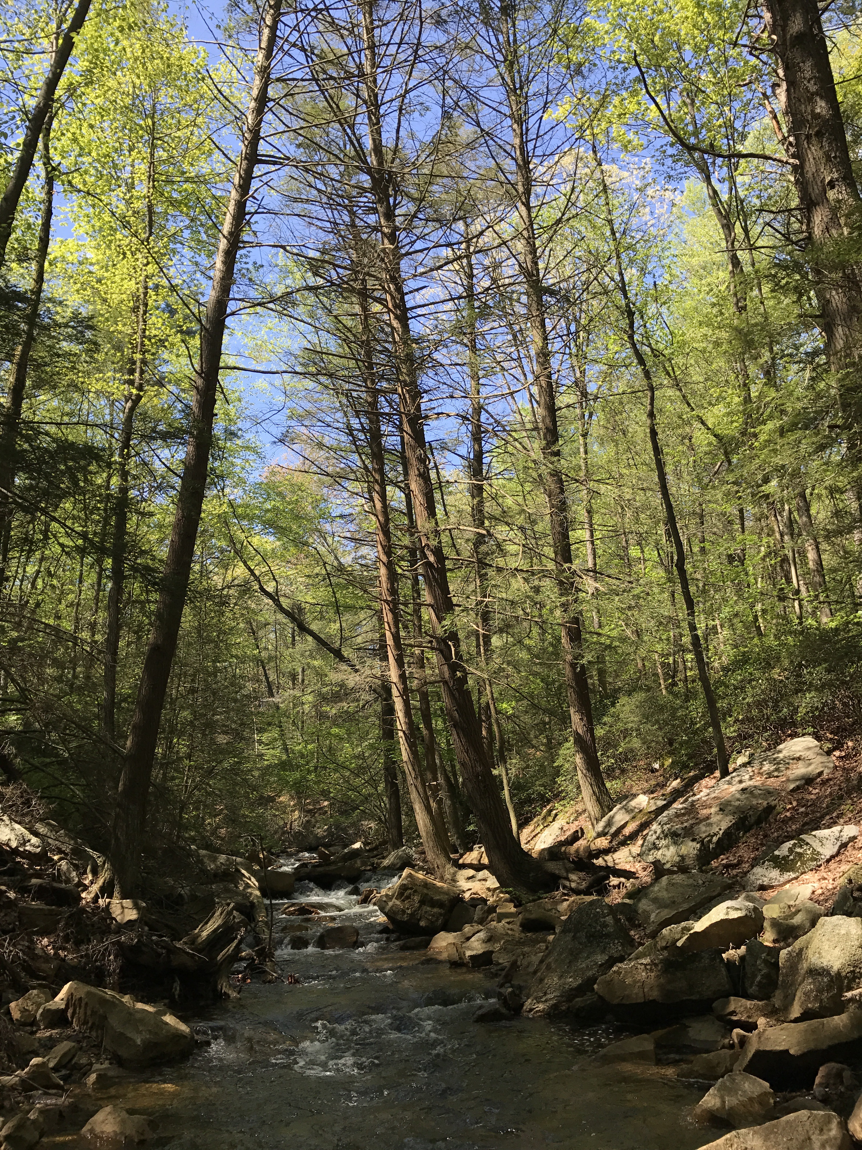 Much of the second half of today’s trail had rhododendron. I’m sad they aren’t blooming yet, and I hope I haven’t somehow timed my hike to be too early for all of my favorite forest flowers. I lost my phone signal right as I hit the stream and didn’t get it back until Chrissy and I stopped for lunch at the campground that used to be an old coal miner settlement. Or it has a trail that leads to the settlement? I’m not sure, but it has this mailbox with the trail register in it.