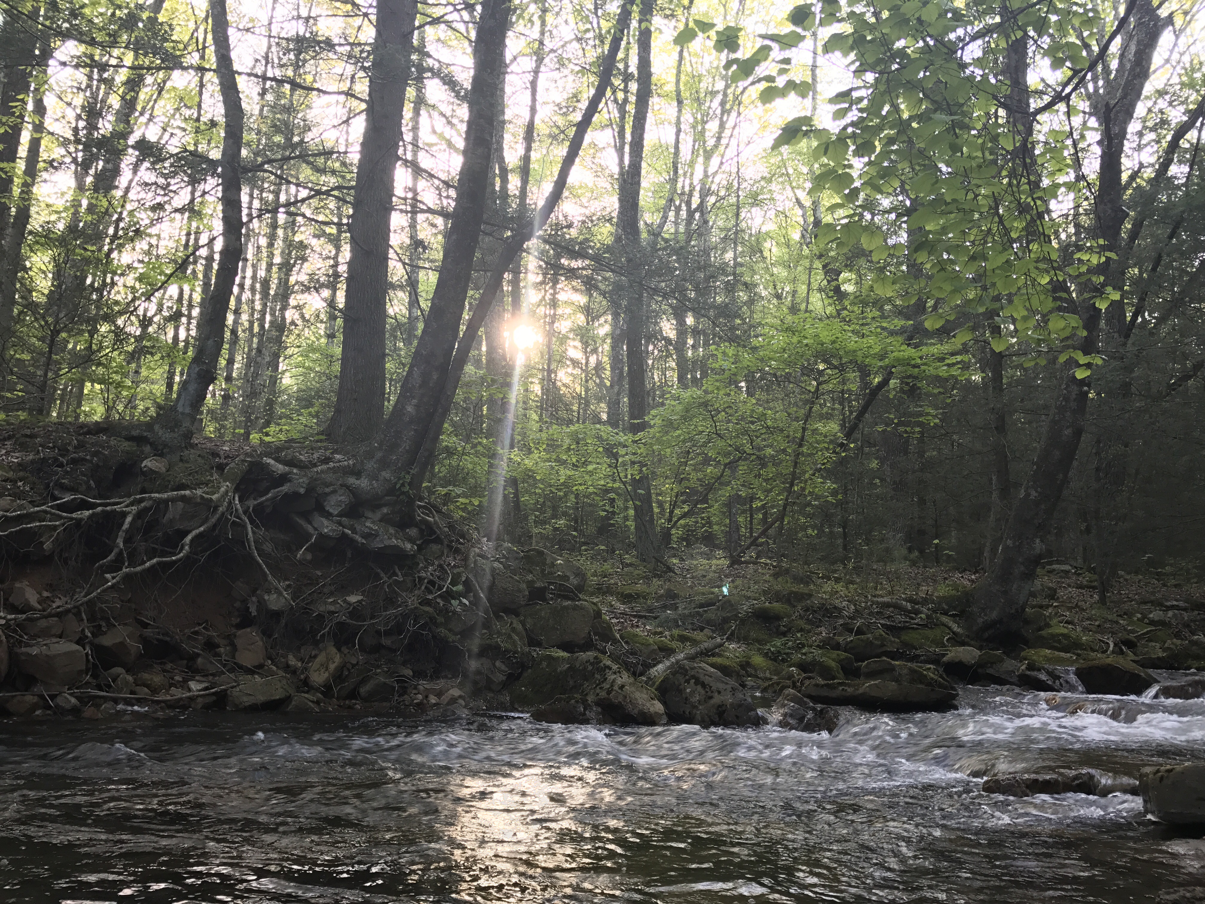 Rausch creek to be exact. It’s set well below the ground level with high eroded sides and trees perched with exposed root systems. We are camped at the tent site about a half mile from the shelter spur trail. The creek nearly drowns out the gunfire from military field exercises nearby.