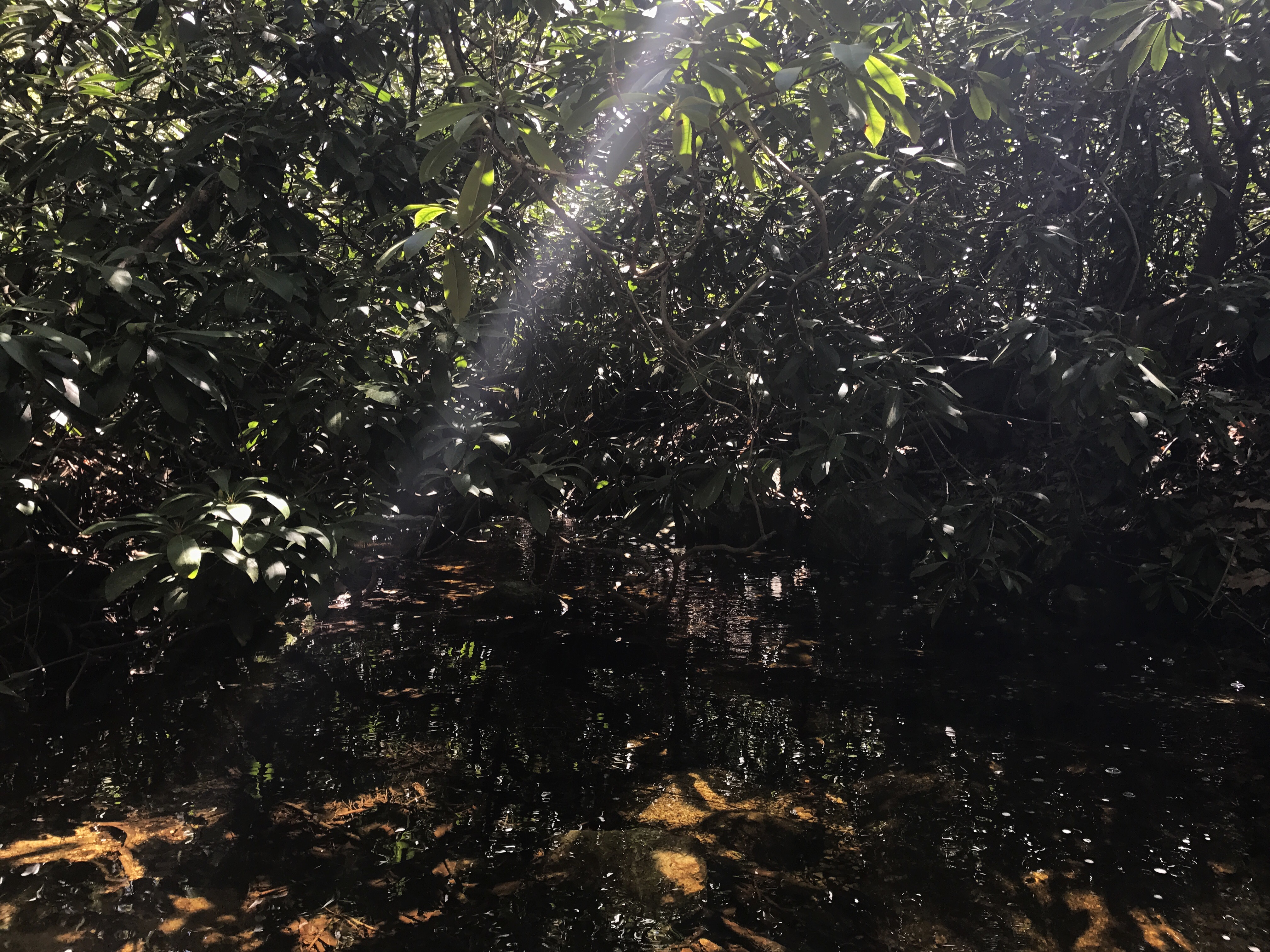 About a mile from our intended stopping point, I ran into Chrissy plopped in the middle of the trail rewrapping the sad spots on her feet. That gave me a chance to be in front her for awhile. The trail eventually switched from rhododendron to mostly evergreens with a black shale like rock that flints when the light catches the surface just right. I heard a loud rushing sound off to my left, which eventually materialized into this fast moving creek.