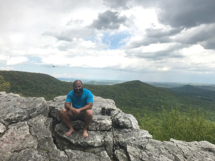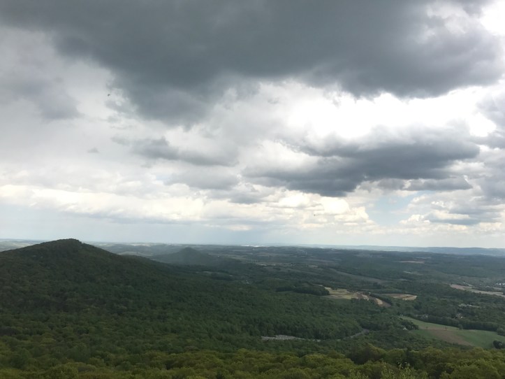 I found jimmy sunning himself on a rock like a snake. He seemed half asleep when I dropped my pack next to him and pulled out yet another snack. It was about 430 and we still had over 5 miles to our destinations so I didn’t stick around long. The trail leading north from the pinnacle was a soggy mess for about 2 miles. Then it switched to a peaceful fire road or hunting road since we were on state game lands. Jimmy and chrissy passed me and I didn’t even try to keep up. We got rained on for about 15 minutes. I was tired and didn’t bother pulling out my raincoat. I was also not excited about getting to camp so late in the evening. But there was a striking view through the trees of the valley and the closest mountain and cascading streams to pull me back into the present.