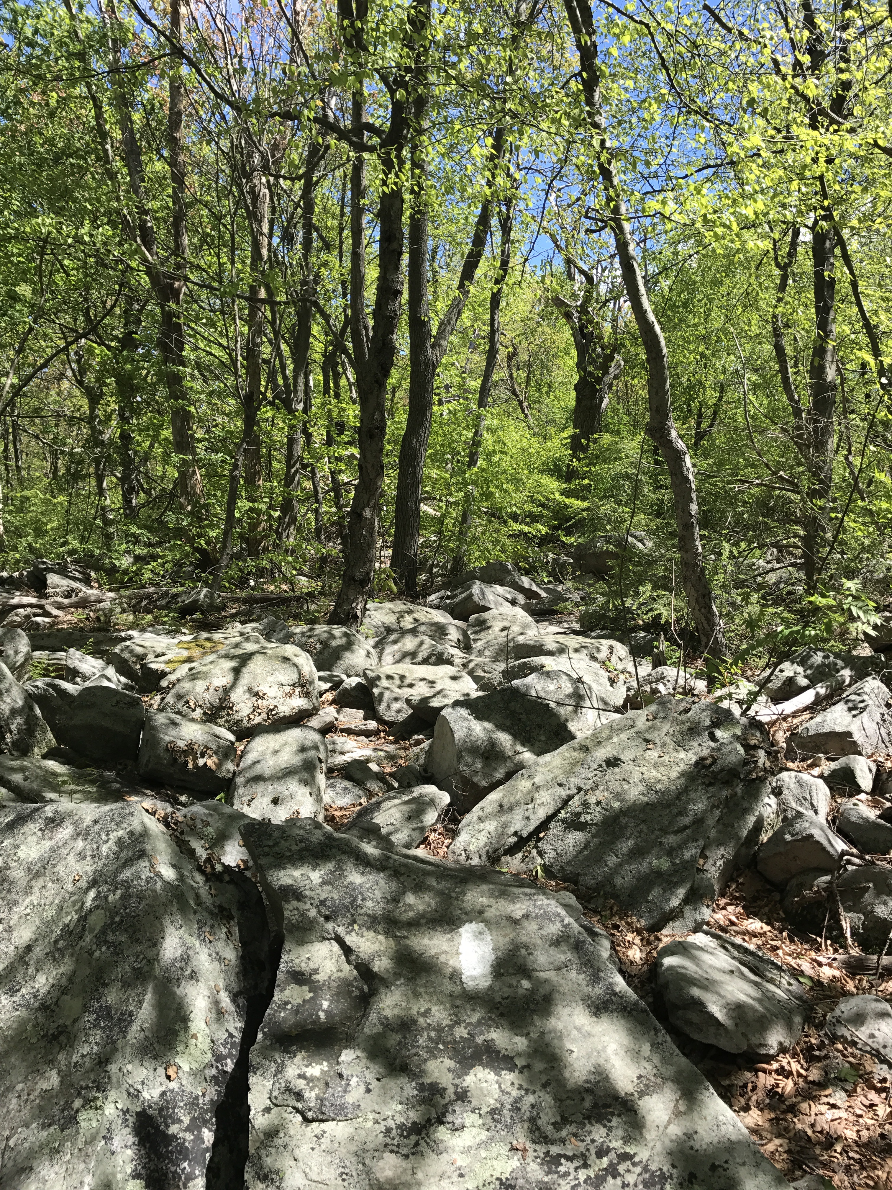 There were a lot of boulder hopping sections today and a lot of shit kicker foot stabbing rocky sections. I ate lunch at an overlook that was a gigantic pain to get to, and I should have skipped it. The view was mediocre, and it involved a lot of giant pointy rocks to get there from the trail. I walked with chrissy for a couple of hours in the afternoon. We talked about our respective mean voices and she talked about her counselor at home.