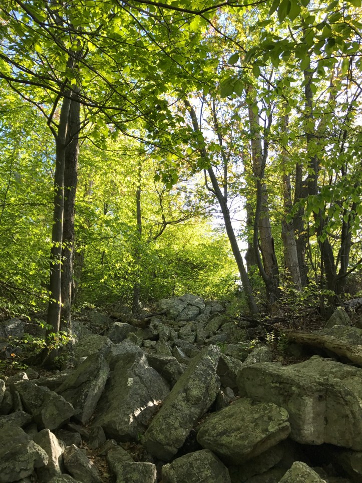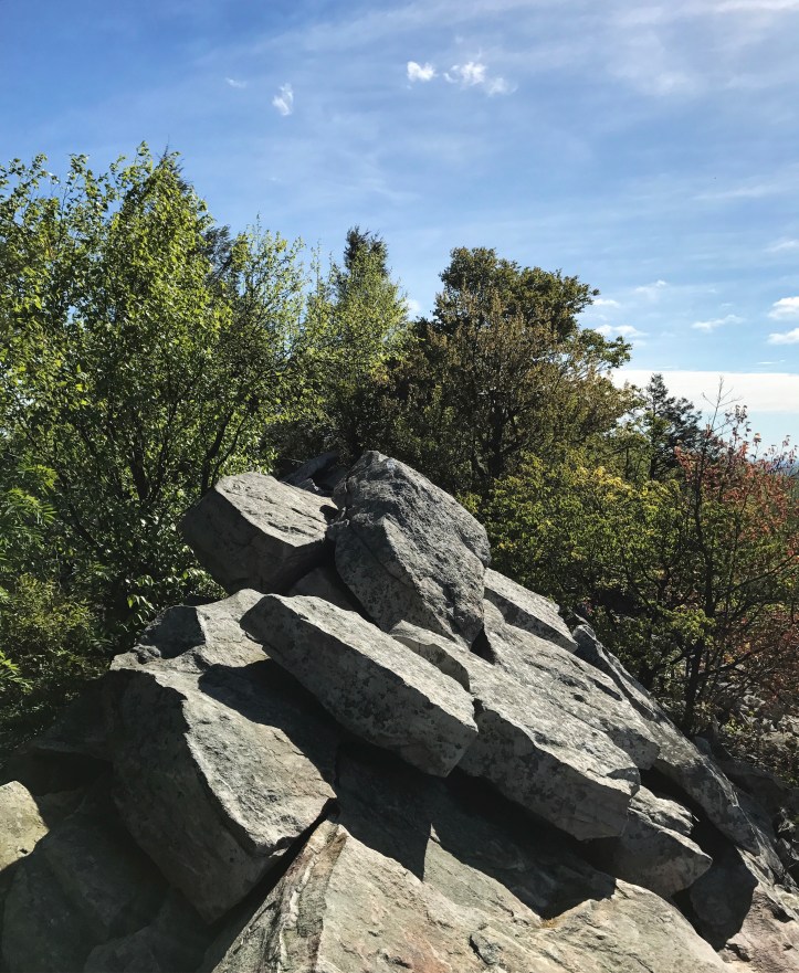Not long after the rocks started, the trail led me up to what’s called knifes edge, which involved crossing a ridge made up of rocks sitting at crazy angles. There were very few flat surfaces to be found. I definitely had to scramble and use my hands. I made it through unscathed and was on my way down the last spine when I heard a guy yelling behind me. Something about “hell of a way to start” He sounded belligerent. Turns out his trail name is Mad Tom and he yells a lot. He and his partner are finishing their AT section hike with PA.