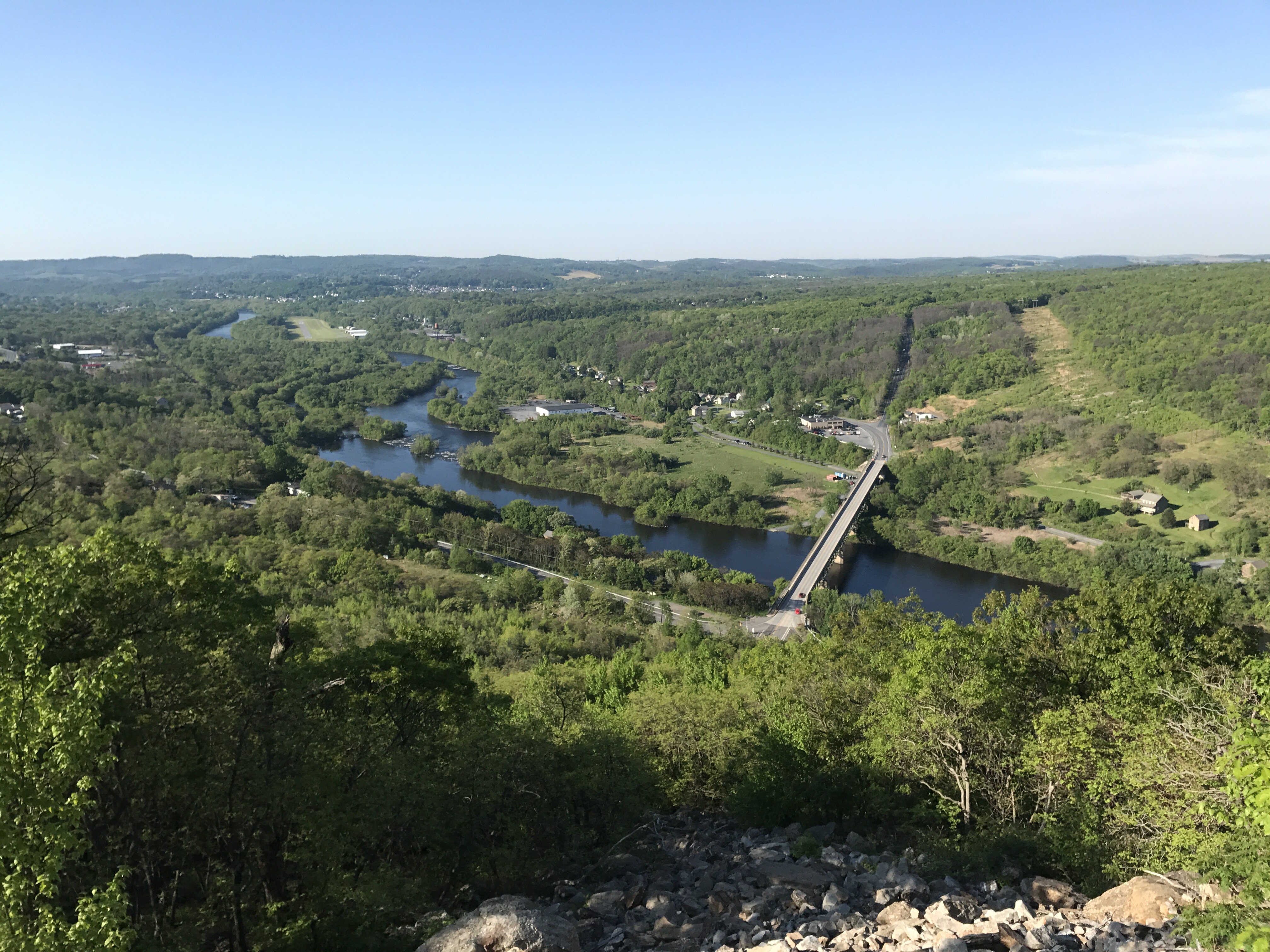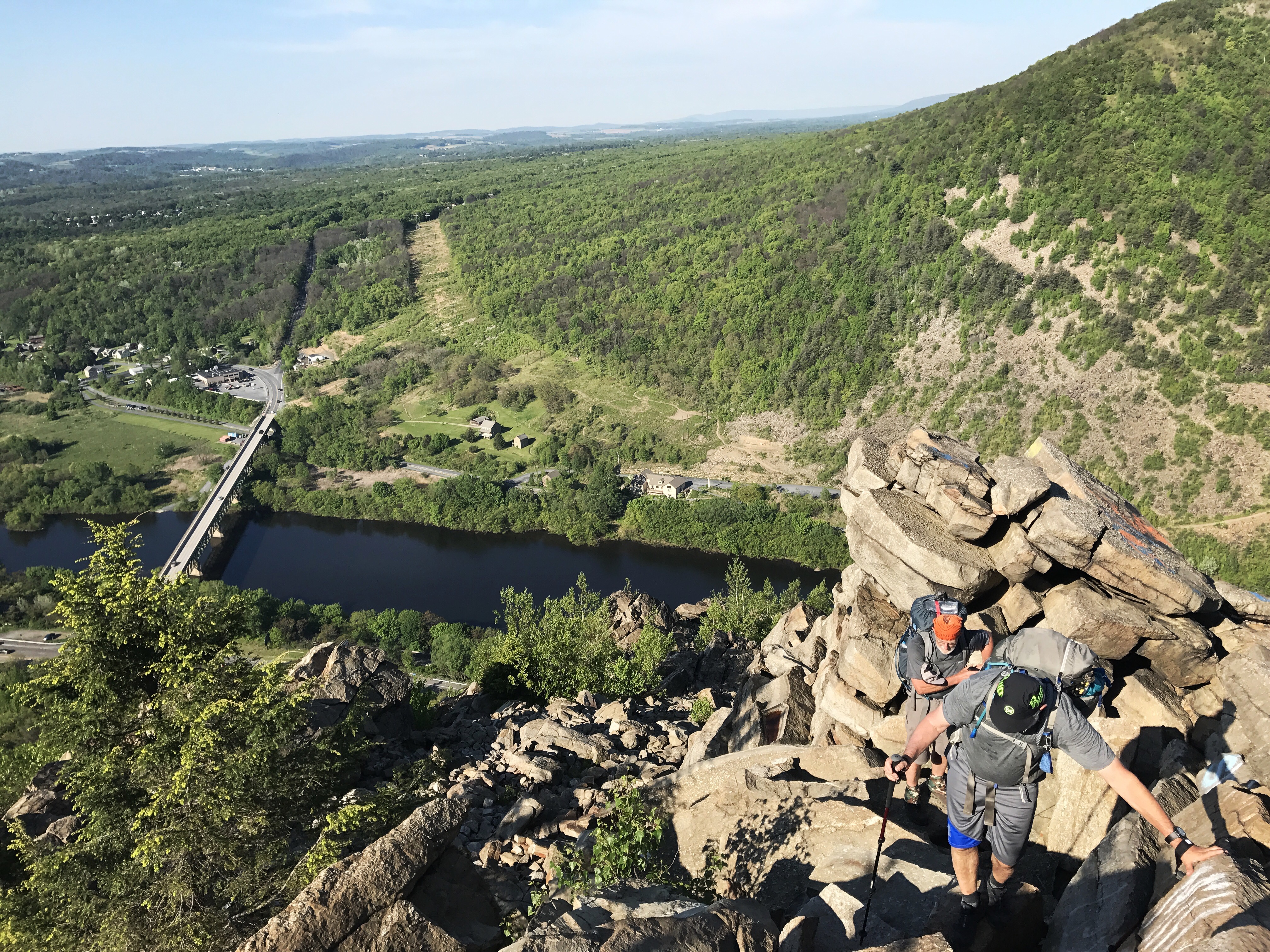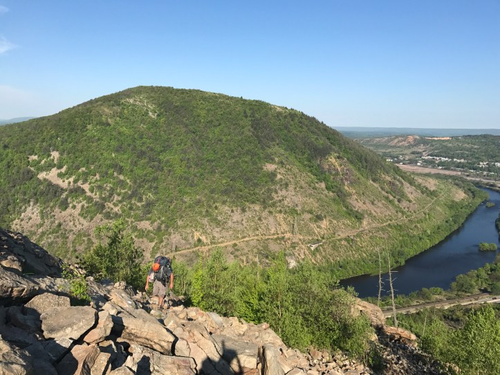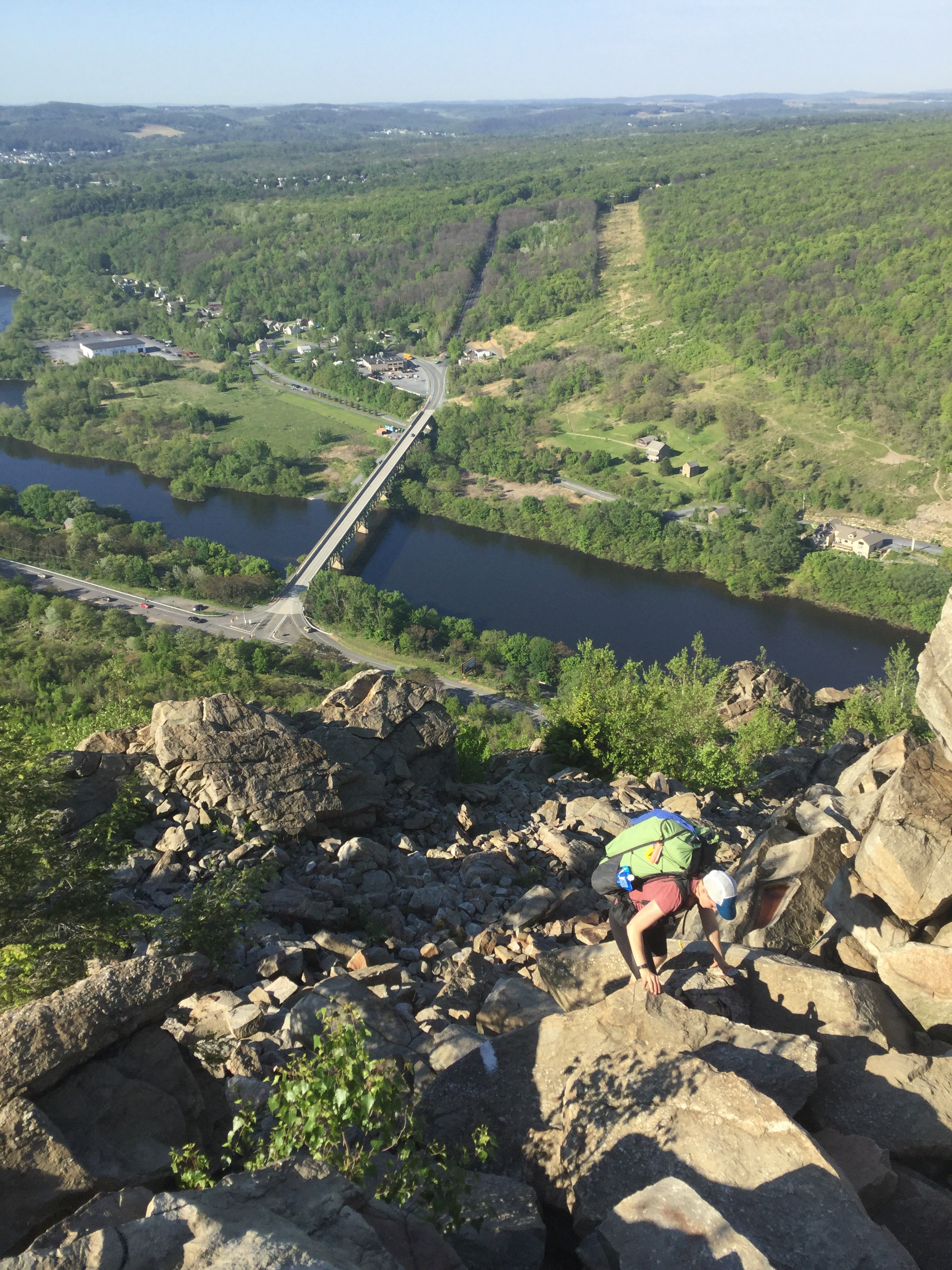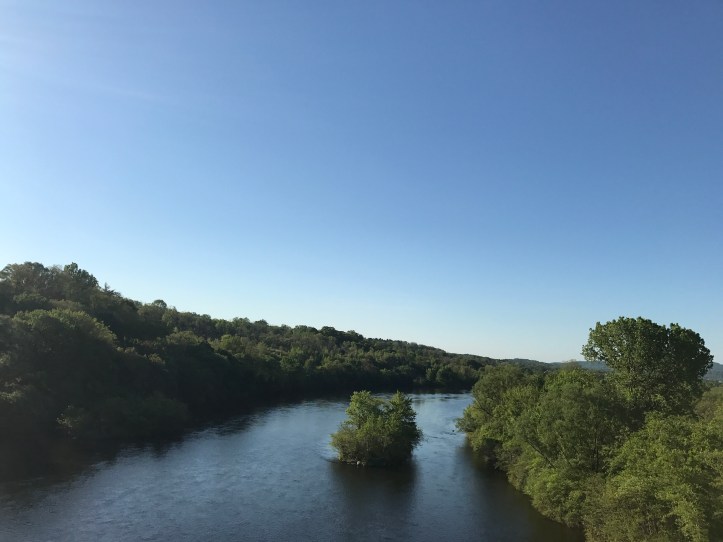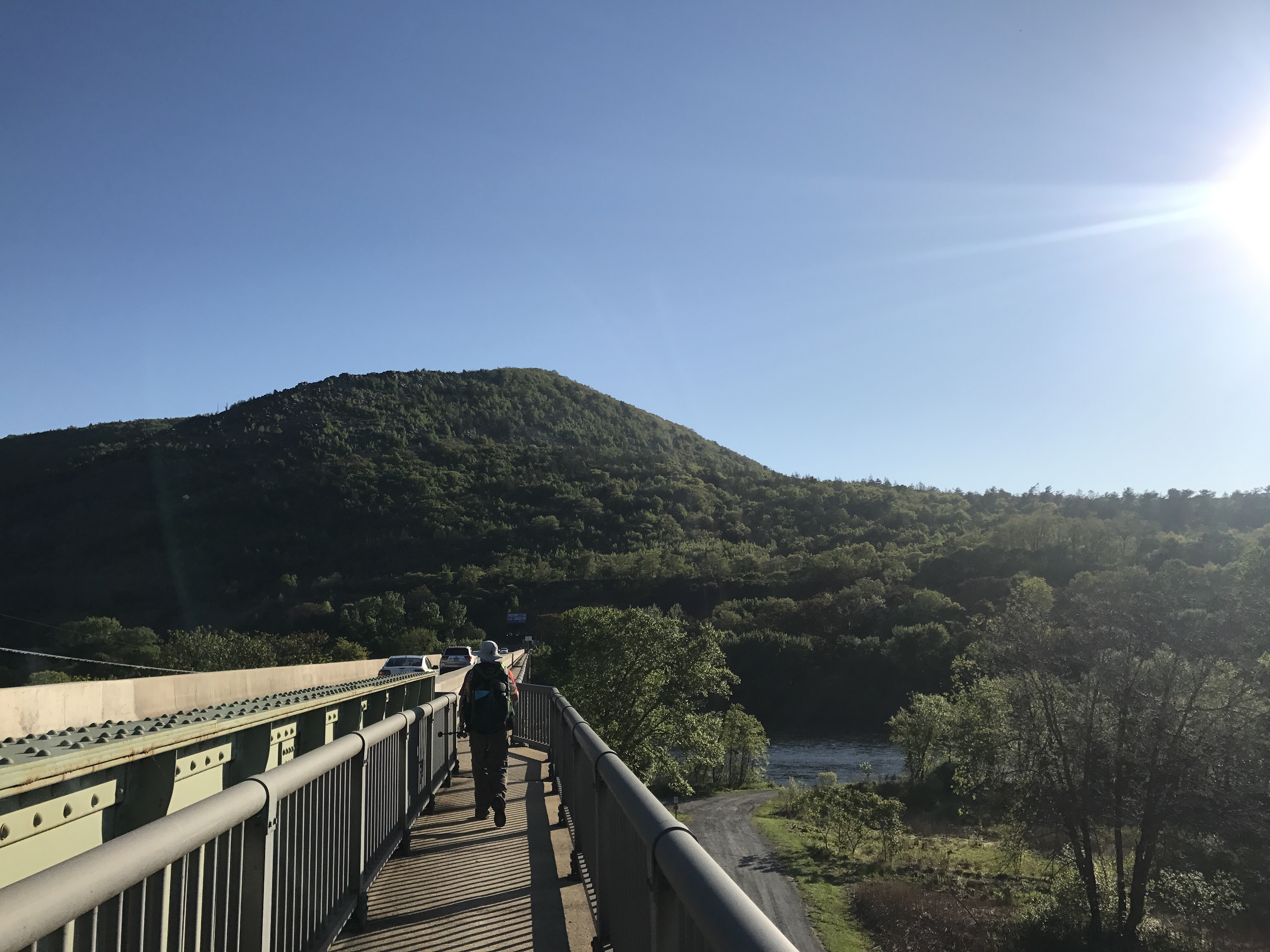 Halfway and I left camp at 725. My fear of injury returned as soon as I put on my bag. The bag sits at the very top of my tailbone, and I knew immediately that it wasn’t going to work at that height. I tightened my shoulder straps To lift the bag off my waist as much as I could. Then I took my stress ball self down the hill to cross the bridge over the Lehigh river.