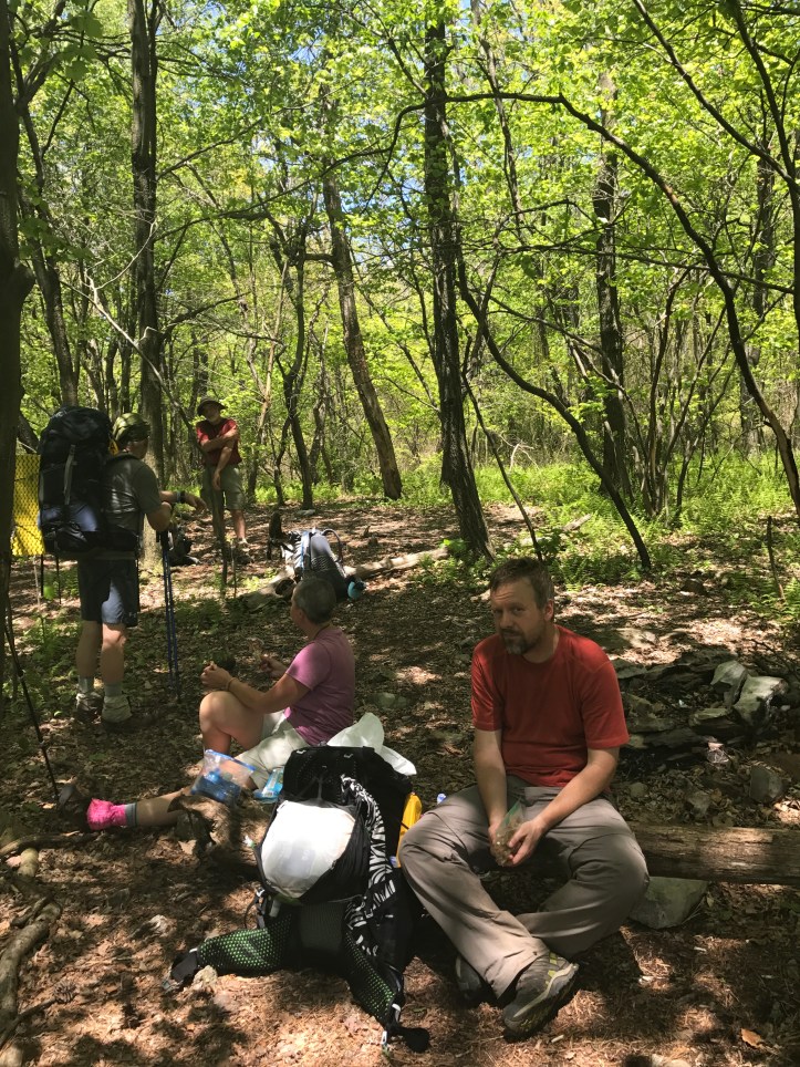There were a lot of people out today. Probably at least a dozen hikers. I finally met buzzcut, whom halfway knows and has been hoping to run into. She seemed to be loosely hiking with two other gentlemen named cujo and JD. Here they all are at a lunch break (along with a tired and sore halfway) later in the day.