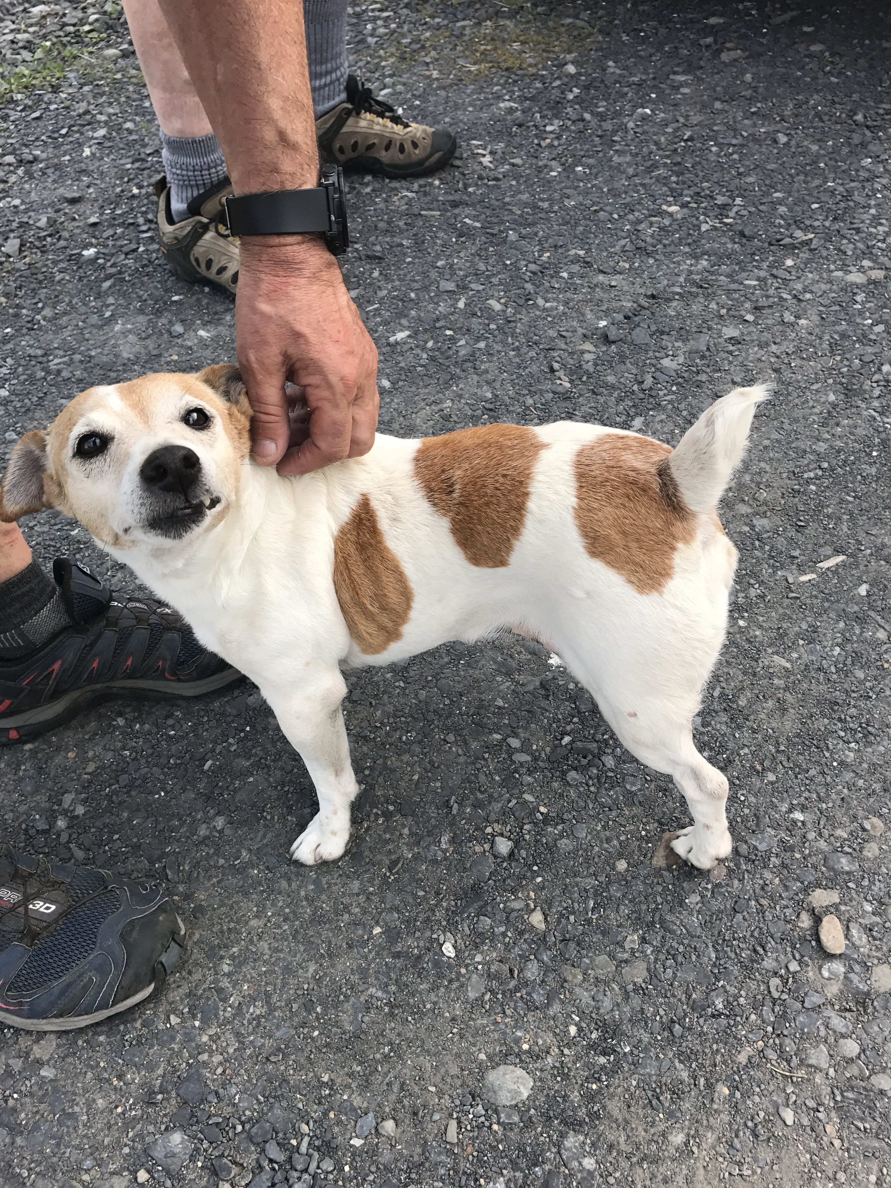 There was a tedious mile long section of rock hopping after the power lines. Then we popped out into a gravel parking lot near a road crossing. I saw halfway laying on the ground and made a bee line for the patch of gravel next to him.