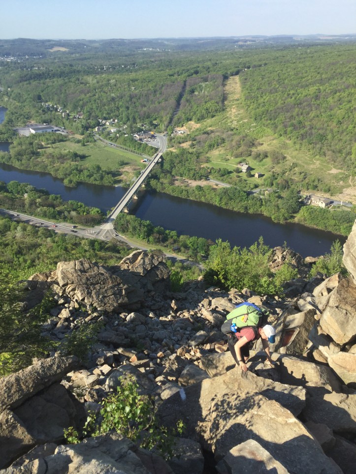 Once we got past this point, the terrain went from scrabbley tree covered path to exposed rock. That’s when things got interesting. The actual climb was that difficult, but the sheer height made it feel treacherous. A misstep or losing your balance could really end badly. I was worried that having to lean over and take large boulder hoping steps would send shooting pain through my tailbone, but it never happened. After several pain free maneuvers, I forgot to be anxious about it, and focused on the task at hand. Halfway caught a picture of me near the top of the scramble: