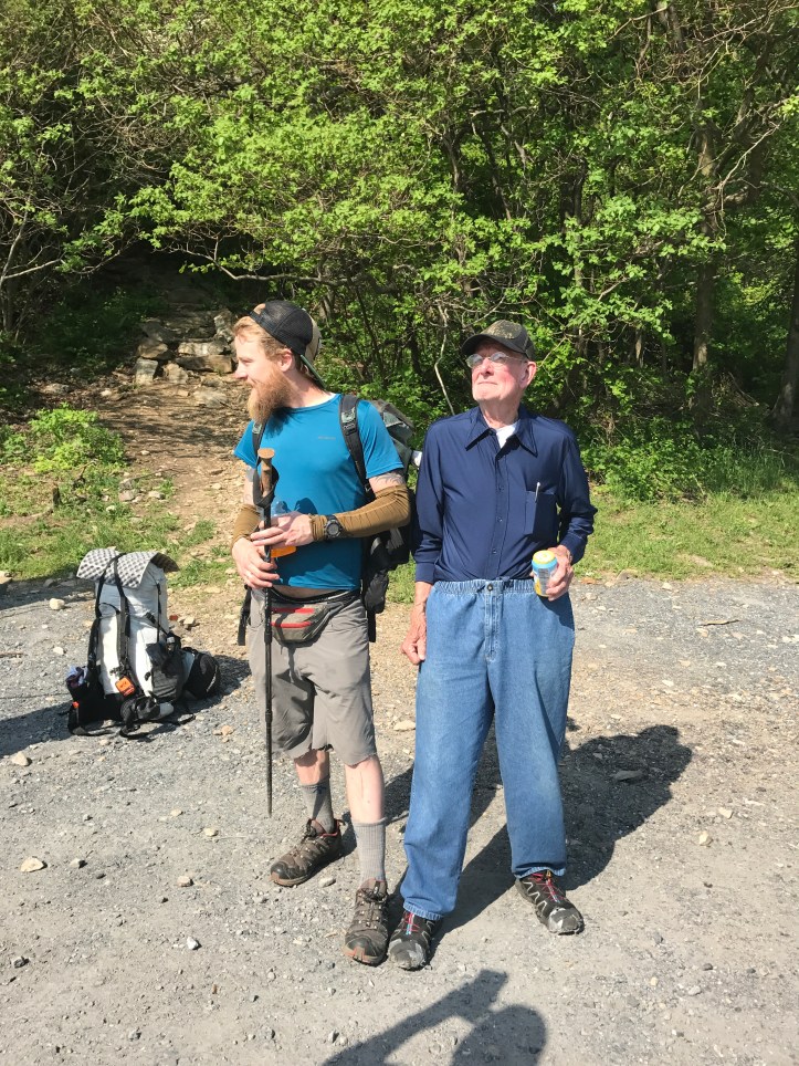Who did we find in the parking lot?? Trail angel don, dropping off a fellow named plant who also happened to stay at millipede manor last night. How do these things happen? Sadly we were all too full to humor don very much. I took a peach because apparently I just want fruit. The sun was also blazing in the parking lot, so we bid don a pretty quick farewell. But before we left he told us a story about finding shoes in one of the shelters and wearing those shoes today for the first time. Then along comes plant (a hiker), whose shoes are falling apart because of the gnarly rocks. Turns out don’s new shoes fit plant perfectly so they swapped. Don was very happy with his “customized”‘duct taped solomons trail runners, which he dubbed his driving shoes.