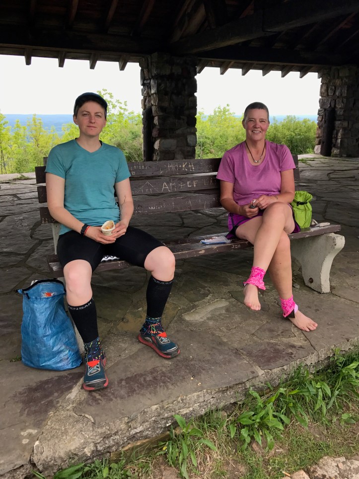 After the tower, there was a gradual, rocky descent that transitioned to a peaceful and forgiving flat stretch that lasted a few miles. Buzzcut and I had plans to eat lunch at the sunrise mountain pavilion, which we did with the company of treebeard who took this picture: