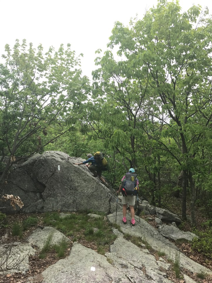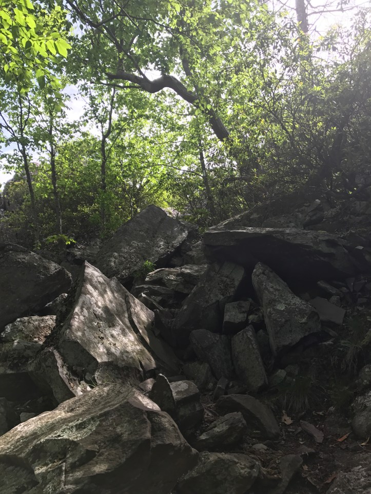 As it turns out, bellvale is very hiker friendly. They have a charging station and a water spigot on the side of the building and a trail registry to boot. I ate my tuna fish wrap first while JD and buzzcut went straight for the sugar. As I sat there adding my frito notions, two hikers walked up and said hey cfunk is looking for you! She’s doing trail magic today (she took a few days off to spend time with her husband and skip the holiday crowds). As it turns out, cfunk who I had been texting with earlier in the day, had a trunk full of goodies: sandwich fixings, beer, cookies, chips, and baby wipes (nice touch). I took a sandwich to go, and ate bag of cheetos on site. I did not drink the beer because I’m holding out for a something special. We went from feeling crestfallen about the closed hot dog stand to the elation of charged phones, ice cream, and trail magic. Pretty incredible. I also laid on the cement wall with my right leg on my pack to soothe my throbbing ankle. So simple, and so helpful. We eventually tore ourselves away from the land of plenty and headed back to the trail. I had hoped for a continuation of the mild terrain all the way to the shelter so that I could convince buzzcut to go longer and stealth camp with me. Sadly, I did not fish my wish. There were two more sections of boulders.