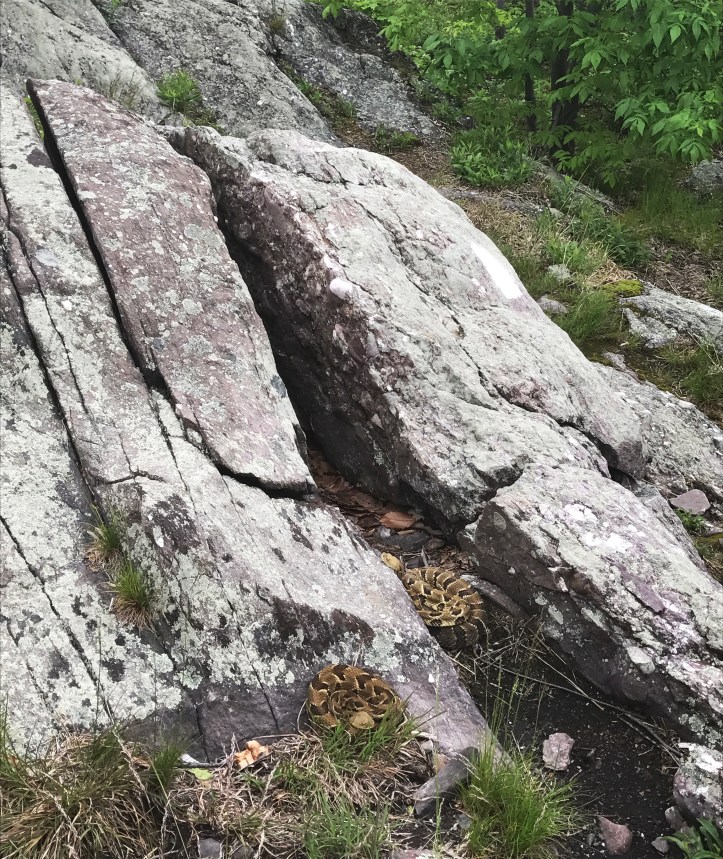 Creature feature: around 11:15 we ran into hikers coming the opposite direction who warned us about two large poisonous snakes sitting in the middle of the rock pathway. They were still there over an hour later: