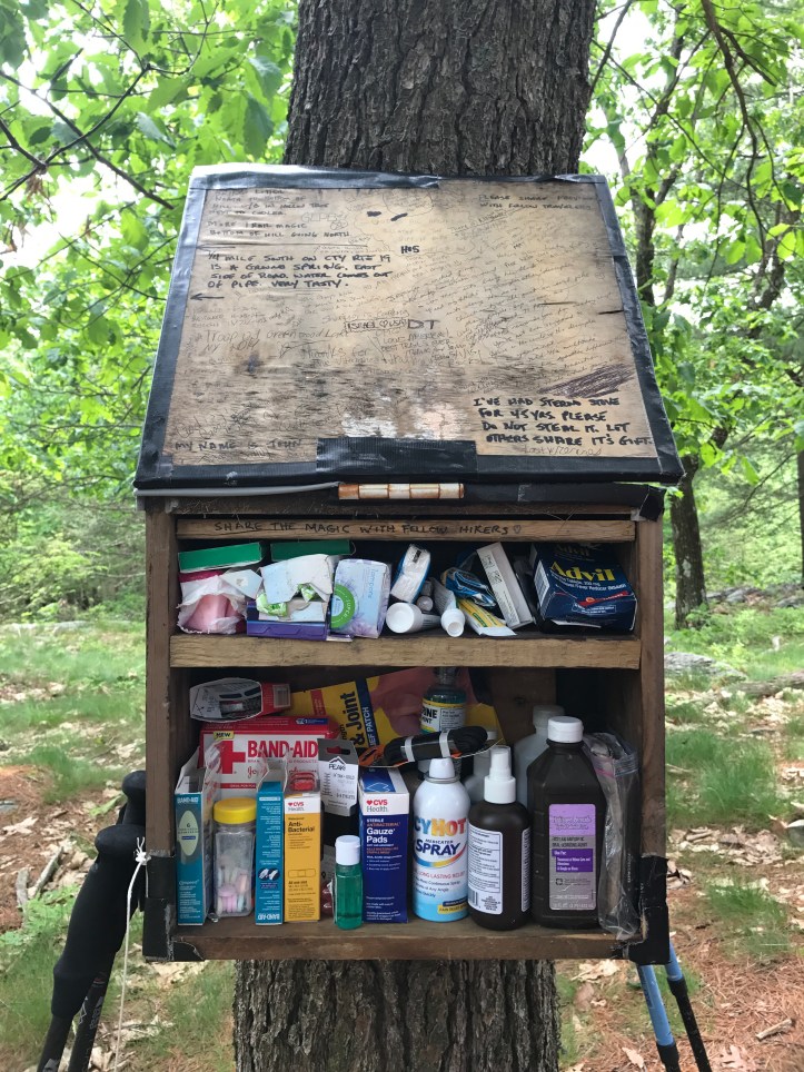 We stopped for lunch at an unofficial campsite that looked like a great spot with a soft pine needle surface, a fire pit and this box of first aid trail magic: