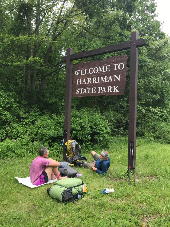 As we were getting one last water fill up, a gentleman walking a large spaniel hunting dog of some sort walked by and said are you guys hikers?? He stopped to chat and buzzcut cut right to the chase asking if he had a truck and if he would give us a ride back up to the trail. The man did not have a truck and skimmed right over the request. We ended the convo shortly after that. JD also had a conversation with him at the fountain wherein the guy told JD it was supposed to rain tonight. Great news at that point in the day. We grumbled and packed up our food. As we were heading back to the road, the gentleman drove up in his car and offered to let us stay at his house. He said we could take showers and crash in the rooms upstairs. I would never have agreed to such a thing if I’d been alone, and I still felt uneasy on the ride to his house in Montvale, NJ. So much so that I wrote down the directions to his House on my phone and sent a picture of his license plate to my steady. He wasn’t any creepier than the next guy; I’ve just seen too many crime shows and too many news reports. But we arrived at his house safely. I’m now showered and laying on my sleeping pad on the floor of his adult daughters room. Buzzcut is snoring her face off in the bed above me, and I’ve stayed up too late writing because I got a late start. It’s supposed to rain for much of tomorrow. Might have to modify my plan to do another long day, especially if JD can’t be convinced to leave this house in the rain.