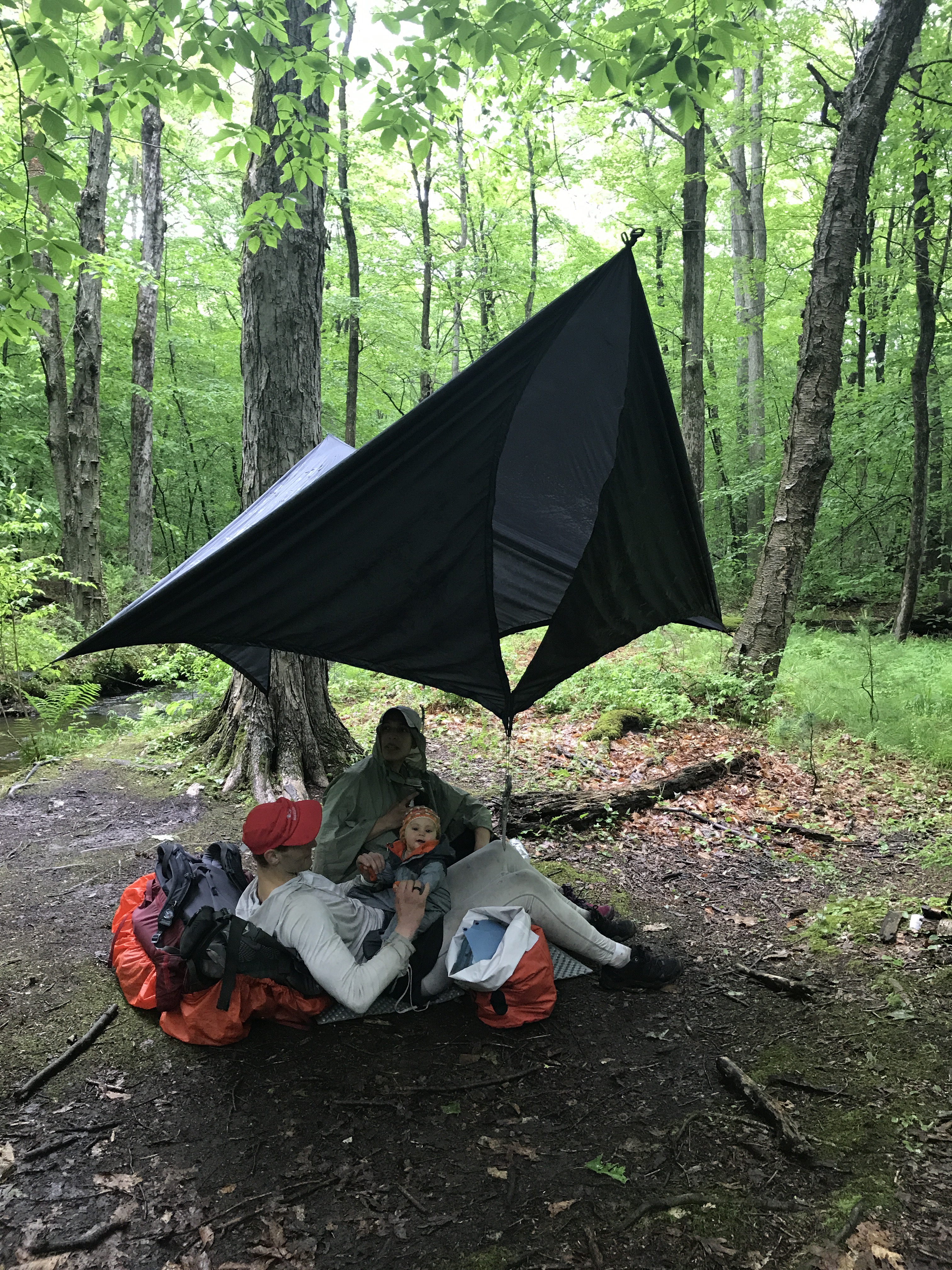 Giorgio of course refused our offers to pay for his gas and the groceries that he bought expressly to make us breakfast. We said goodbye to him at Arden Valley Road, and he went off into the woods with his dog. I tried to walk quickly to warm up in the cold drizzle, but the rocks were slick, and I felt like my feet were cinderblocks. I had to slow down for fear of tripping or stepping in a way that would hurt my cranky ankle. The woods in that part of Harriman felt expansive. There were mammoth boulders amongst large, spread out trees with fern ground cover. I tried to look around me, but I was just too cold. I considered stopping to put on another layer, but I knew that within the half hour, I would probably be comfortable enough. I’d rather have a dry mid layer for later than start sweating in a little while and have to stop all over again for a wardrobe change. It feels funny to call my collection of clothes a “wardrobe.” I’ve worn the same 2 shirts for the last 35 days with the variety of either having my Rapha wool shirt or my rain coat as a top layer. When I get to camp and I’m done setting up whatever sleep system is going in place, things start to get crazy. That’s when I put on my puffy coat. Living at the crusty fringes of fashion.