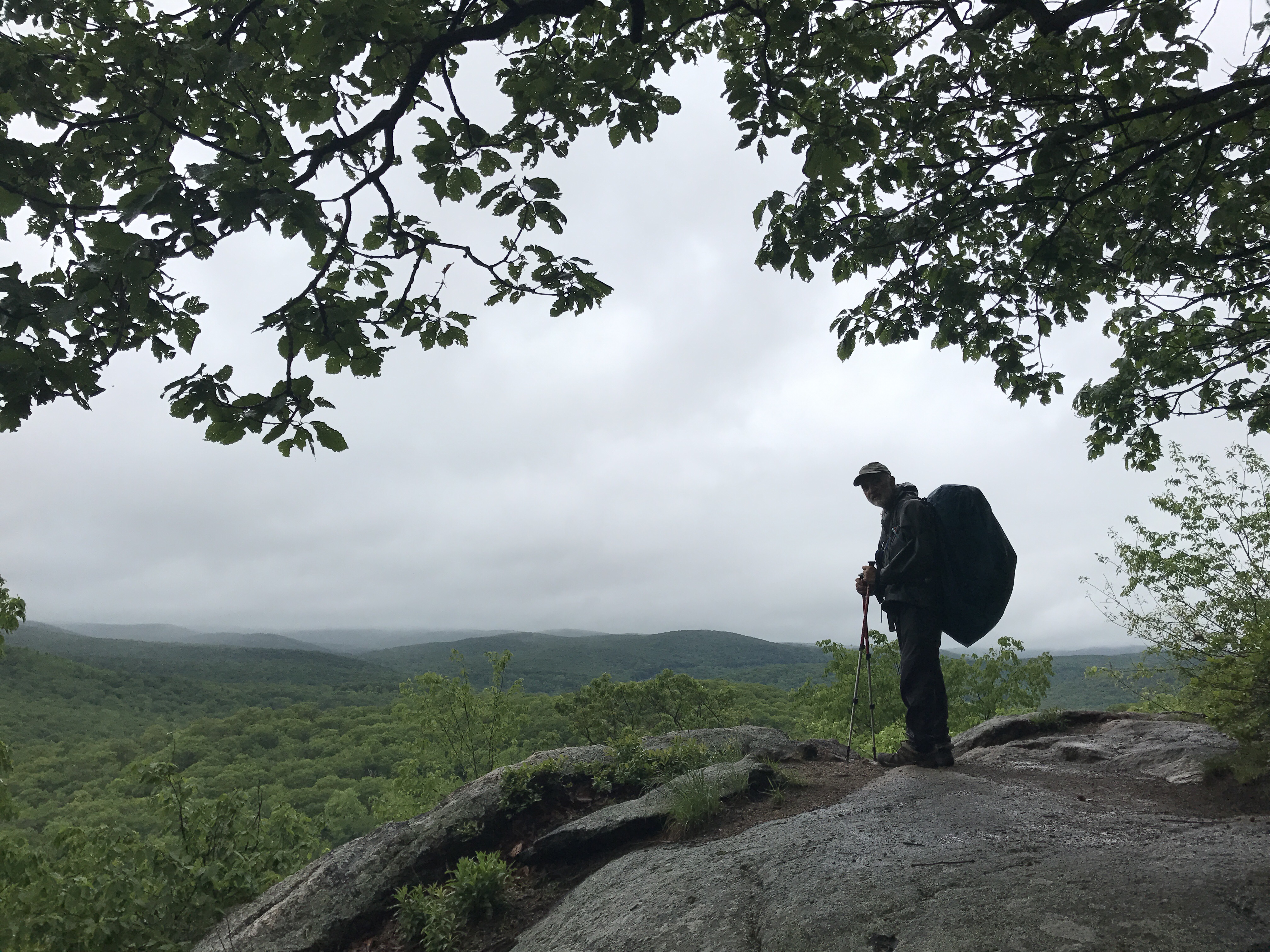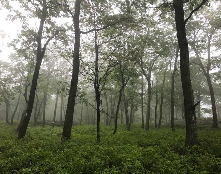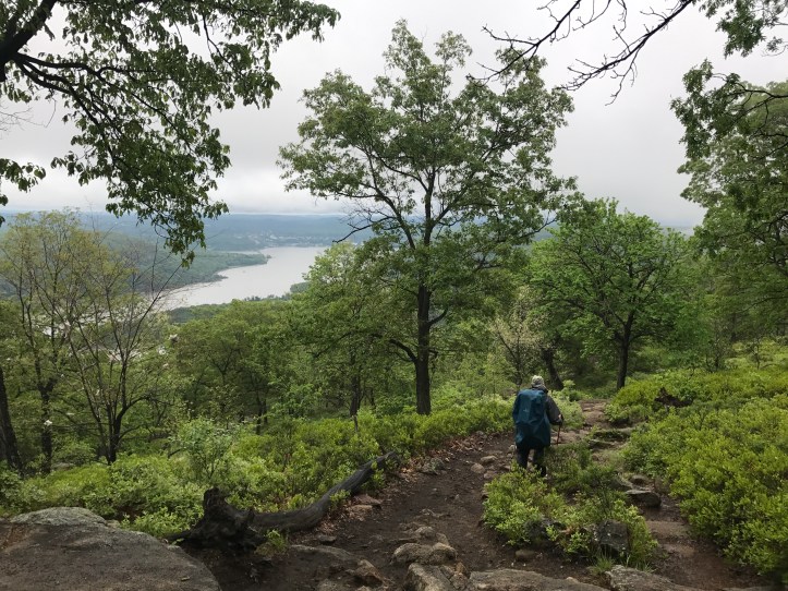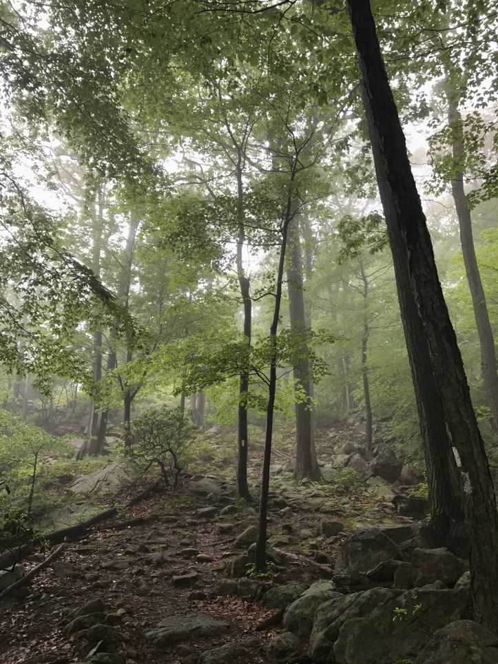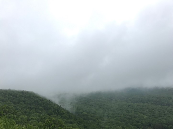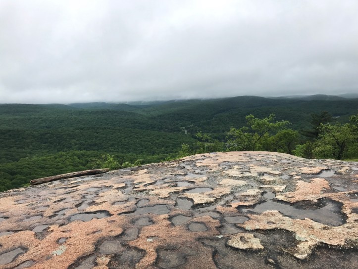 I told everyone I knew to avoid bear mountain on a weekend, and had accidentally arrived there on a major holiday. But the weather saved me from having to elbow check people and feel like a smelly weirdo. When we finally got to the bear mountain overlook, it was absolutely deserted. I couldn’t believe it. The last time I was here, the place was crawling with tourists and weekenders. JD and I stopped at the Overlook to catch a wider view of the cloud covered mountains we had been seeing all morning, and then kept moving down the other side of the mountain. I hiked that section of the AT last October with a group of friends I know from banjo Camp and my former partner. I can remember how my friends got really excited about the idea of leaving something there for me to find on my hike. They didn’t do it for logistical reasons, but the memory made me feel like I had good company as I winced my way down the never ending set of stone steps that was only mildly broke up by flat stretches of crushed gravel.