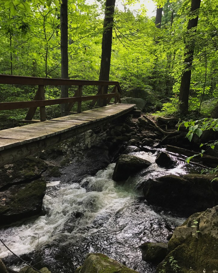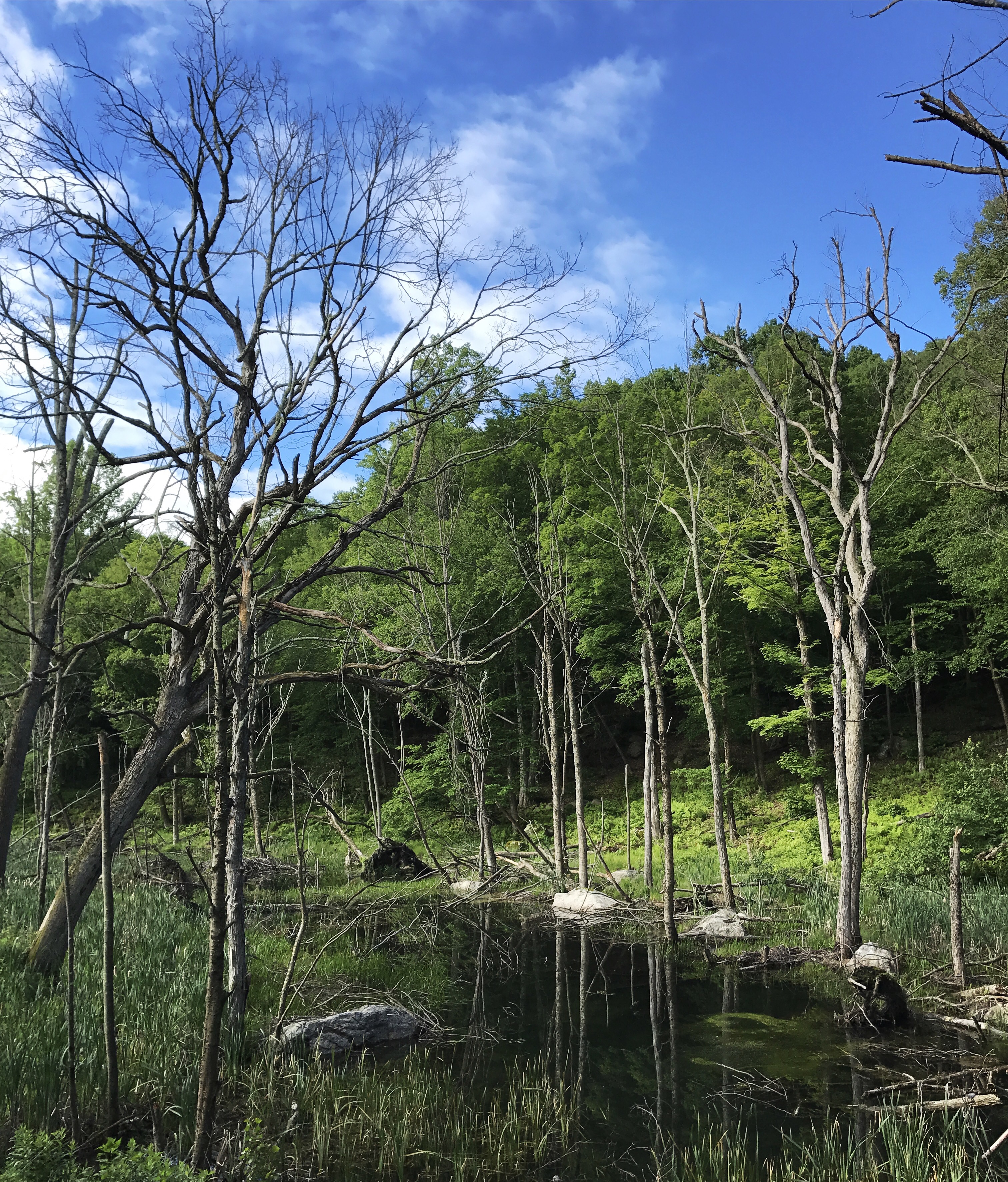 The sun was out nearly all day and the temperature remained at the top end of perfect hiking weather once it warmed up. The morning started with a leisurely stroll down to this bog next to railroad tracks and past this rushing stream.