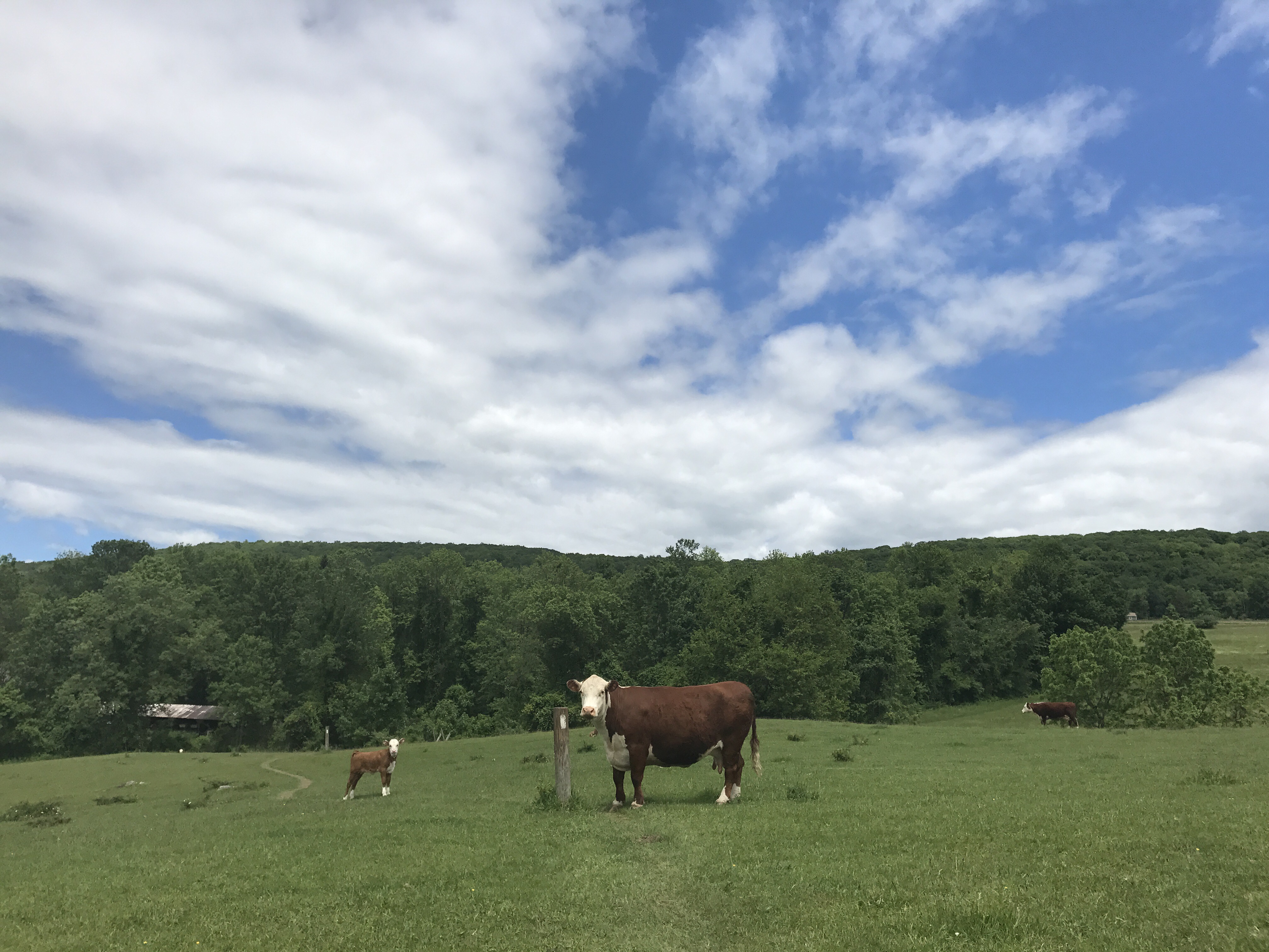 Which led me to cows (top picture)! Cows are LARGE, and there were several calves in the field. One of the larger cows was scratching her head against the trail marker directly in front of me. She stared me down and scraped her foot against the ground. Something about her body language and the calf standing so close to her made me wary. I had visions of being bumrushed by a cow, so I turned around and gave her some distance. Then I waited for her to tire of the pole and wander down the hill a bit. I know I nothing about cow behavior, but I’d rather wait around than end up trampled by a protective mother.