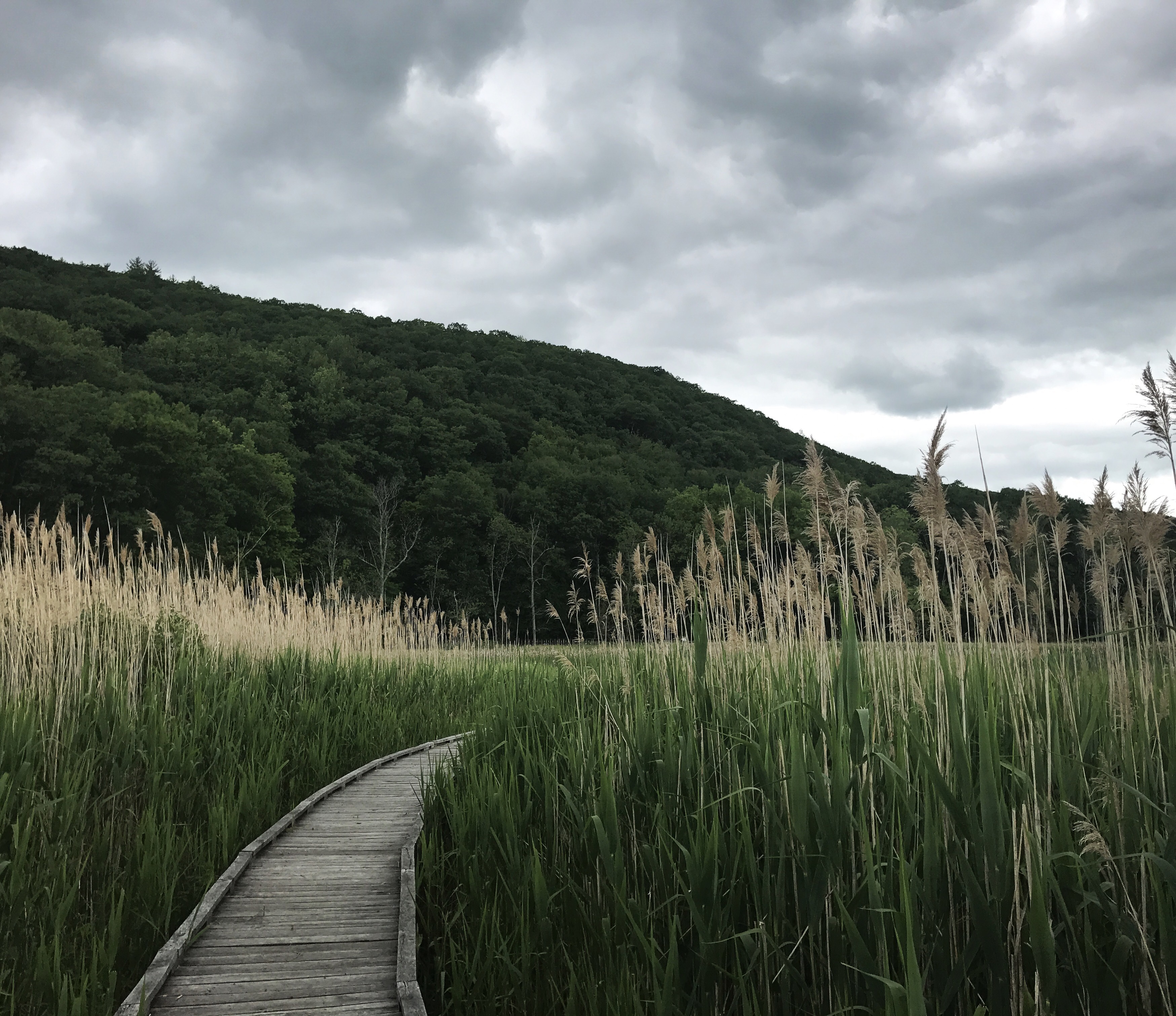 Eventually the trail took a hard left into swamp/marshlands (this view is actually south from whence I came because the light was better than northbound). I sat at one of the benches watching swallows dive into the tall grass and listening to red wing blackbirds whileI rested my feet. They’ve been pretty sore today with little provocation in the way of terrain (the rocks have been practically nonexistent). There’s something otherworldly about walking along a boardwalk surrounded by grass that goes above your head.