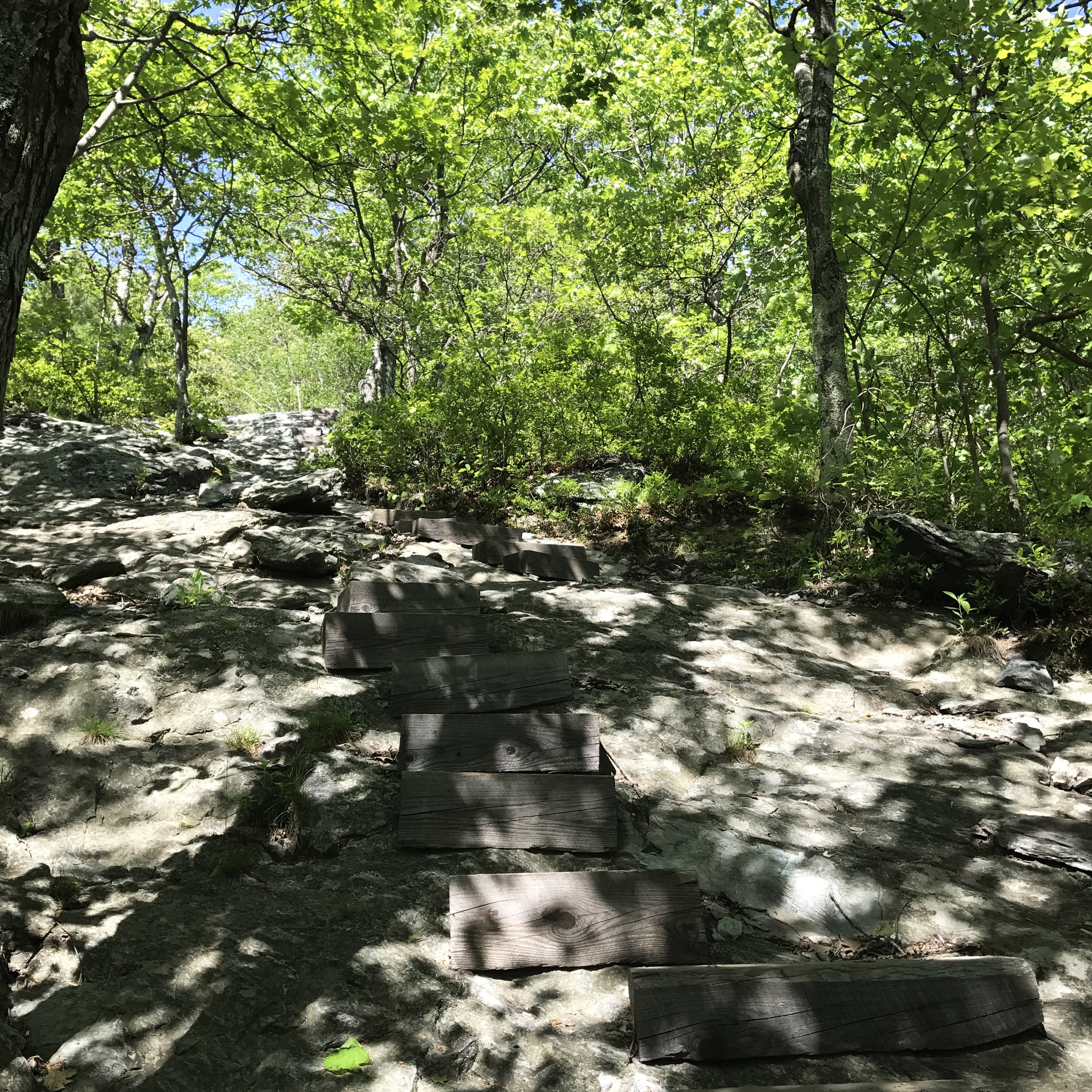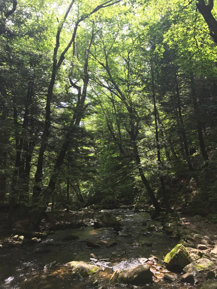Here’s the view from the summit of CT’s bear mountain. I didn’t stay up there long because it was in full sun. The climb down was about as bad as I expected. I can’t believe zach did it in the rain. There are so many flat rock faces that you have to go down that would be murder when wet. The walk from bear mountain down to sages ravine went through a pine forest that felt good on my feet when I wasn’t tripping on exposed roots. I took a 2 night backpacking trip last year with fp and our dog friend, and we spent our first night at sages ravine. I can remember feeling sad and frustrated that we had to end our weekend and that we had gone such a short distance (on purpose). I guess I got what I wanted because there’s no end in sight for this trip and it’s just a few miles longer.