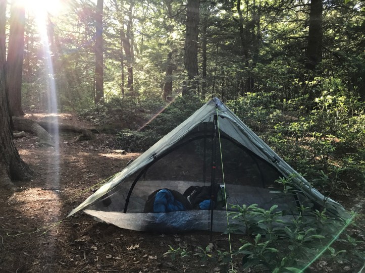 I set up my tent in between a few mountain laurel bushes on a bed of pine needles while I talked to my mom on the phone. Then I had dinner at the picnic table with a few new people. A man in his 50s going by the name 5 year plan, a woman of roughly the same age named Birk, and another woman who I would guess is in her late 60s named intrepid. She’s a talker. She’s like half my size but she can really move with her pack on. She definitely passed me multiple times yesterday when I met her for the first time.