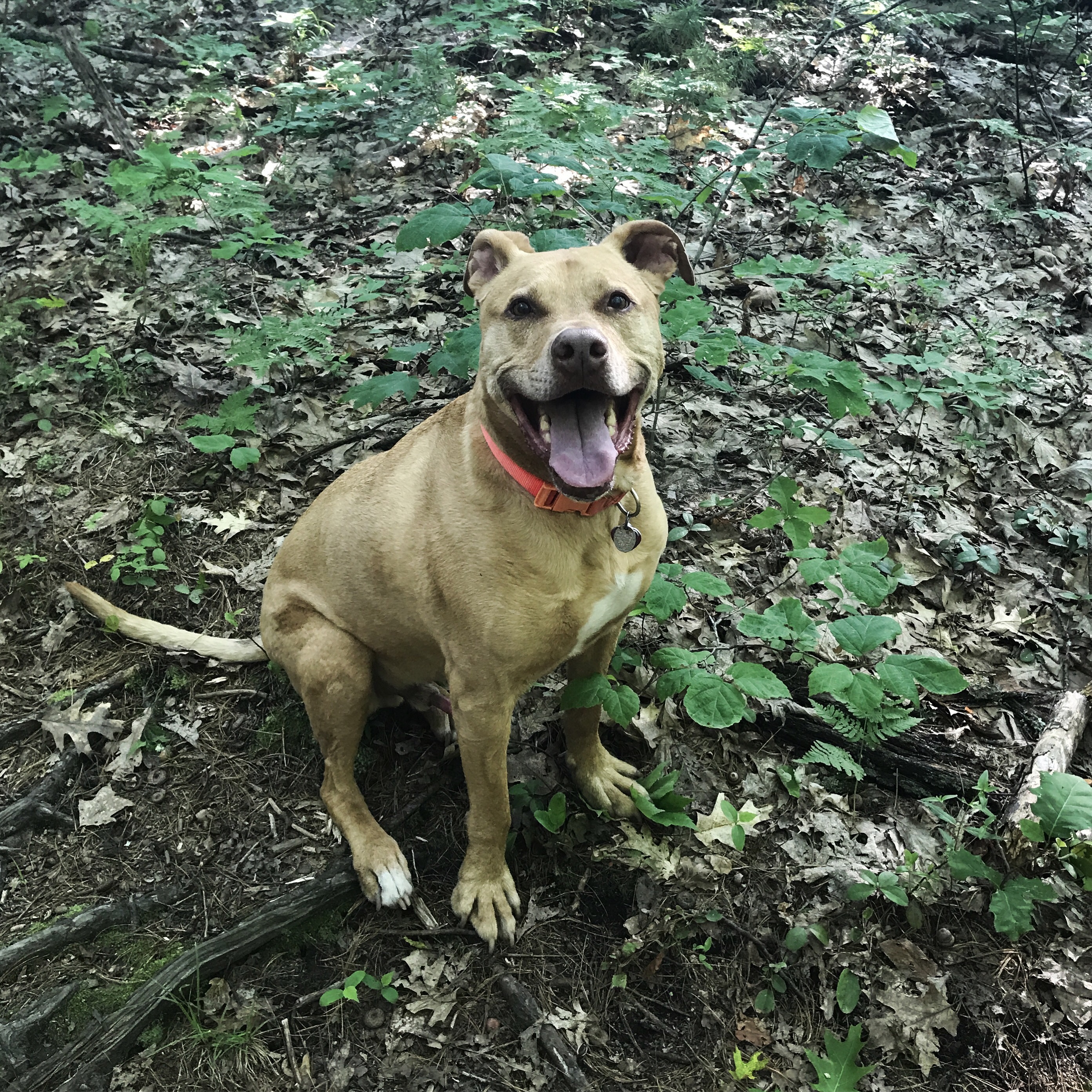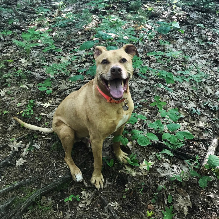 The trail followed ridge and vacillated between full sun on the eastern side of the ridge and dappled shade when it turned westward. Somewhere in there, I heard a large rustling. I had been expecting a squirrel or maybe even a bear, so when I saw this cutie, it took my brain a minute to compute that I was looking at a dog: