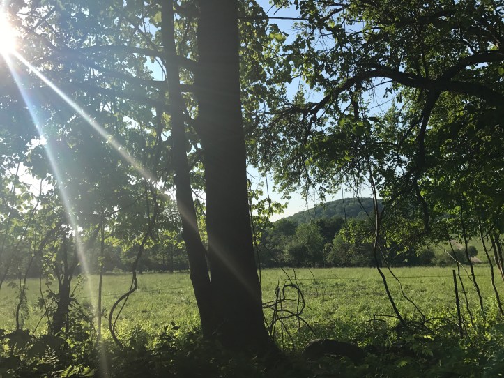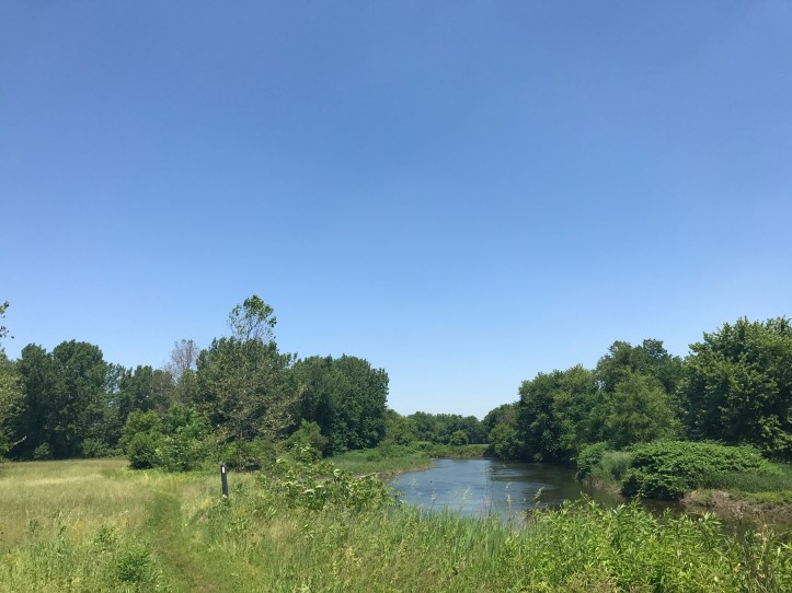 When I hit the crossing for route 7, I felt exhausted and hungry. My feet were sore, steamy pancakes. I sat in the shade, by the side of the road and considered my options: stay by the loud road or walk on and hope for something shady by the river ahead of me. I wasn’t in the mood for road noise, so I pushed on. The trail led through an overgrown corridor that crossed a stream and opened into a series of fields.