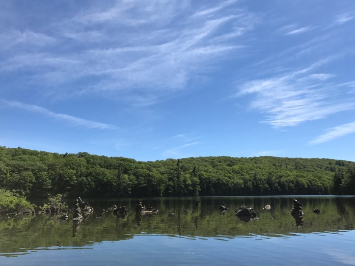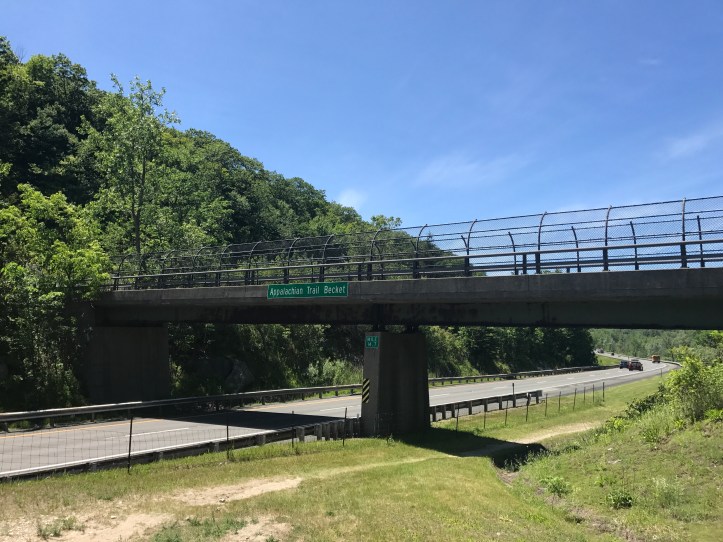 The trail was not memorable (besides some blooming laurel), but I will say that it was thankfully headed away from the pond, which meant fewer bugs and mucky rock piles. My feet were still sore and on the edge of nervy, which confirmed that I was making the right choice. For once, I wished that I wasn’t hiking any miles, but 2 felt manageable enough. I did it in an hour, which was a vast improvement over yesterday’s pace. The trail crossed over highway 80 and wound past a lake and then I hit the road crossing for the hotel.