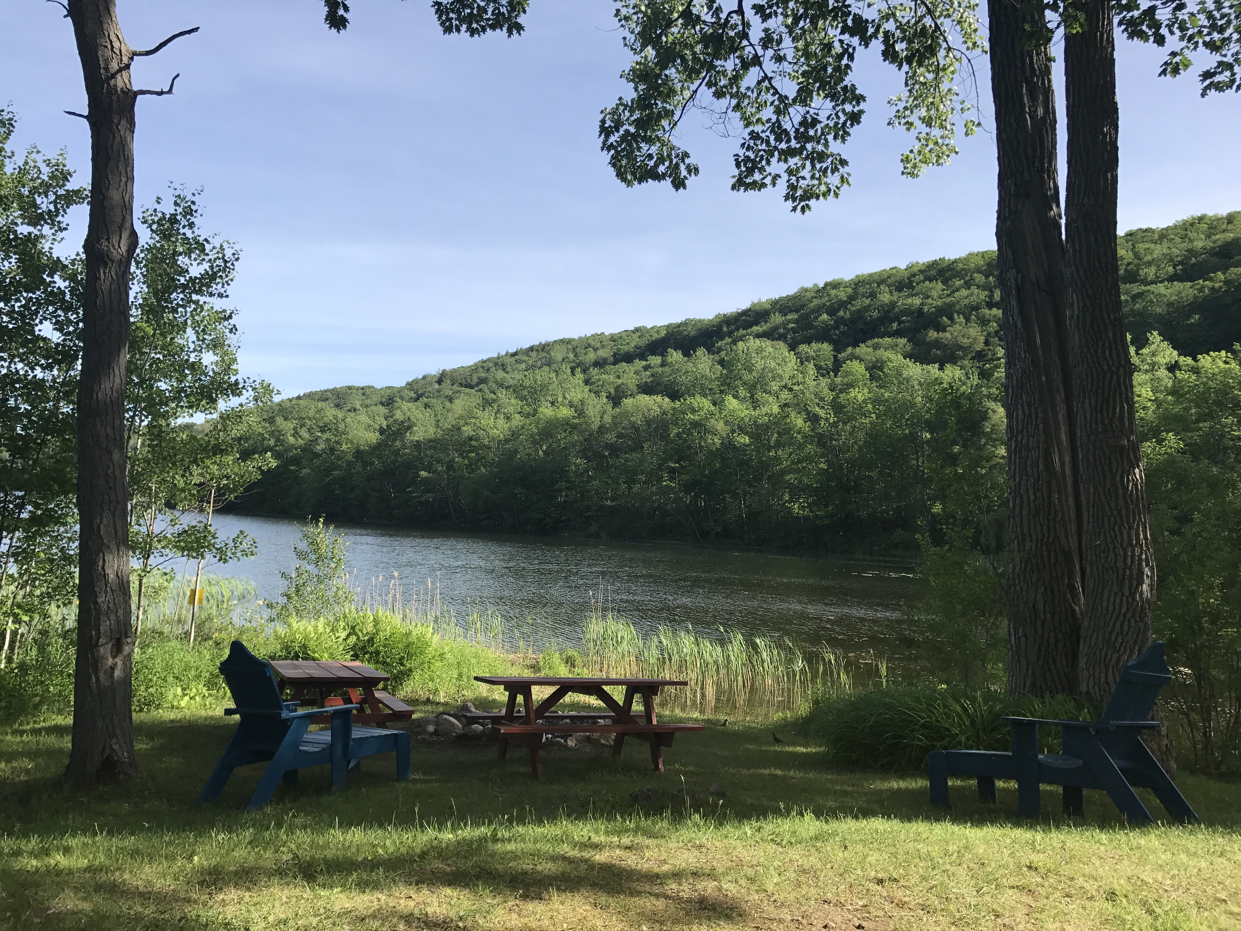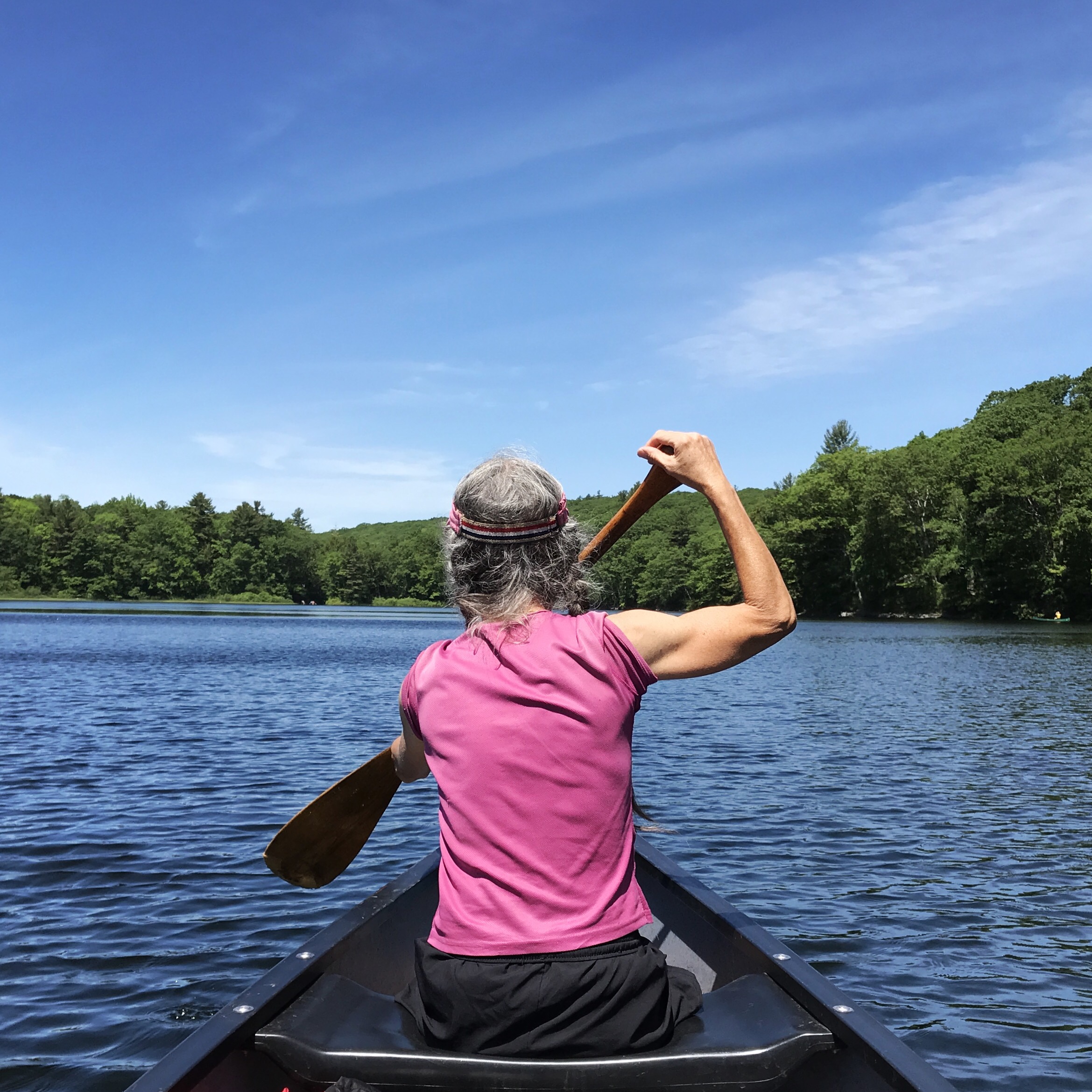 When they came back, they were discussing plans to go canoeing (for recreation this time). Intrepid asked if I would like to join her and I considered saying no because I assumed it would aggravate my tailbone and lower back, butthe weather was so perfect and the water looked so peaceful. I couldn’t resist. Intrepid said, “okay, if you come with me I’m going to pretend that I’m alone.” Little did she know how perfect that scenario is for me. I agreed to the arrangement with enthusiasm and we all walked down to the beach area. Intrepid had the smart idea of bringing an extra life jacket for me to sit on as a cushion. I took the back and she took the front. Somehow I ended up doing a lot of the paddling as we meandered around the pond. Upper goose connects to a larger pond that we aren’t allowed to paddle because of hikers in previous years trespassing or some such nonsense. That was fine with me because it was far more residential than upper goose.