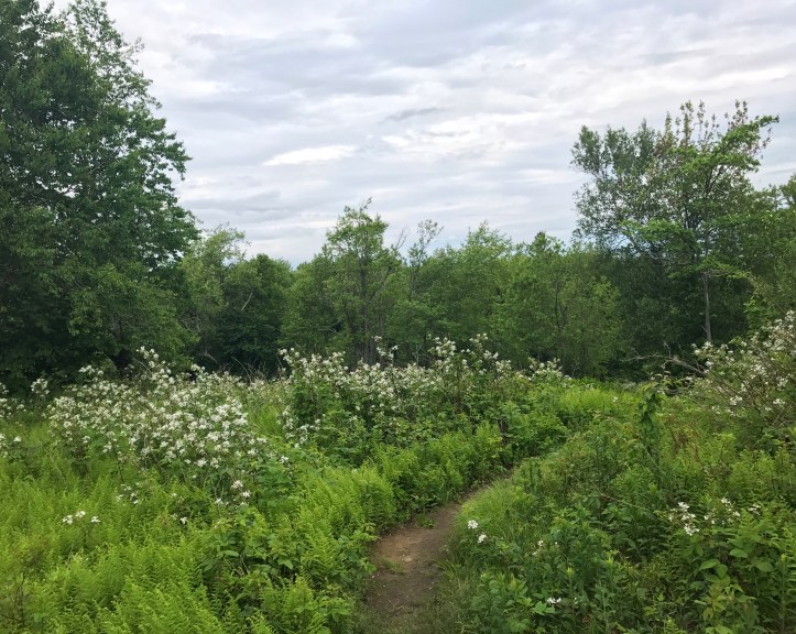 I left the Wiley property at 650 and was back on trail by 655. The first section was a continuation of dense forest with evergreens, poplars, and thick ground cover. There were periodic boardwalks, some of which have seen better days. I like the ones that look like they were handmade from a tree rather than the 2×4 wooden planks. I patiently picked my way through the roots and tried not to get upset with my pace as people passed me. I can’t fail at hiking just because I walk outrageously slow, right? How do other people seem to be undisturbed by their feet rolling over roots and pounding down hills? I’m talking about people wearinf trail runners as well as boots, in case you’re thinking, well get different shoes, dummy. I’ve historically had trouble with sore feet no matter what type of shoe I wear, so I don’t know why I expect this to be any different.