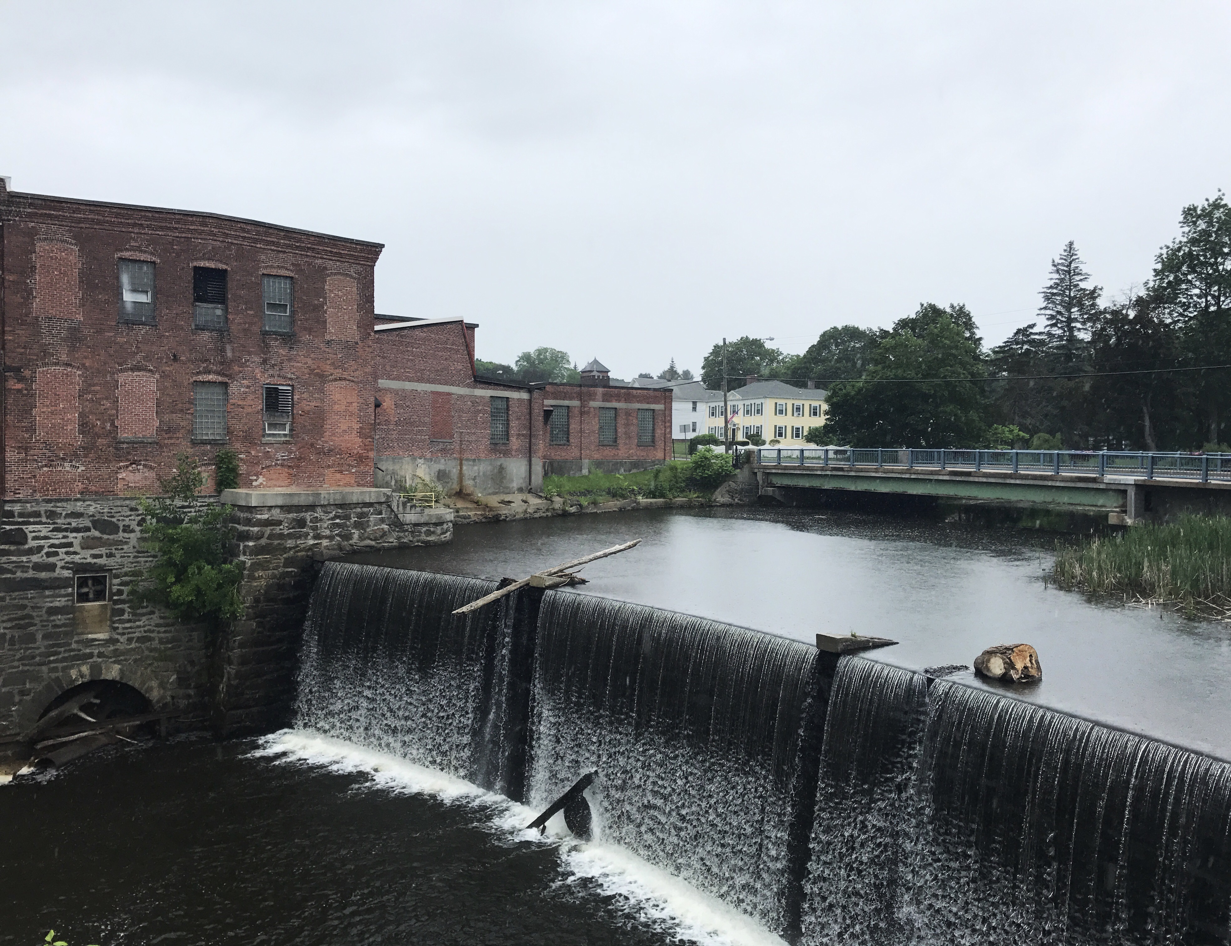 A church announced the noon hour as I descended into town. Car horns and a weed whacker greeted me as I came to the railroad tracks marking the beginning of the road walk through dalton. It started to drizzle as I approached the corner where the housatonic flows through town (top pic).
