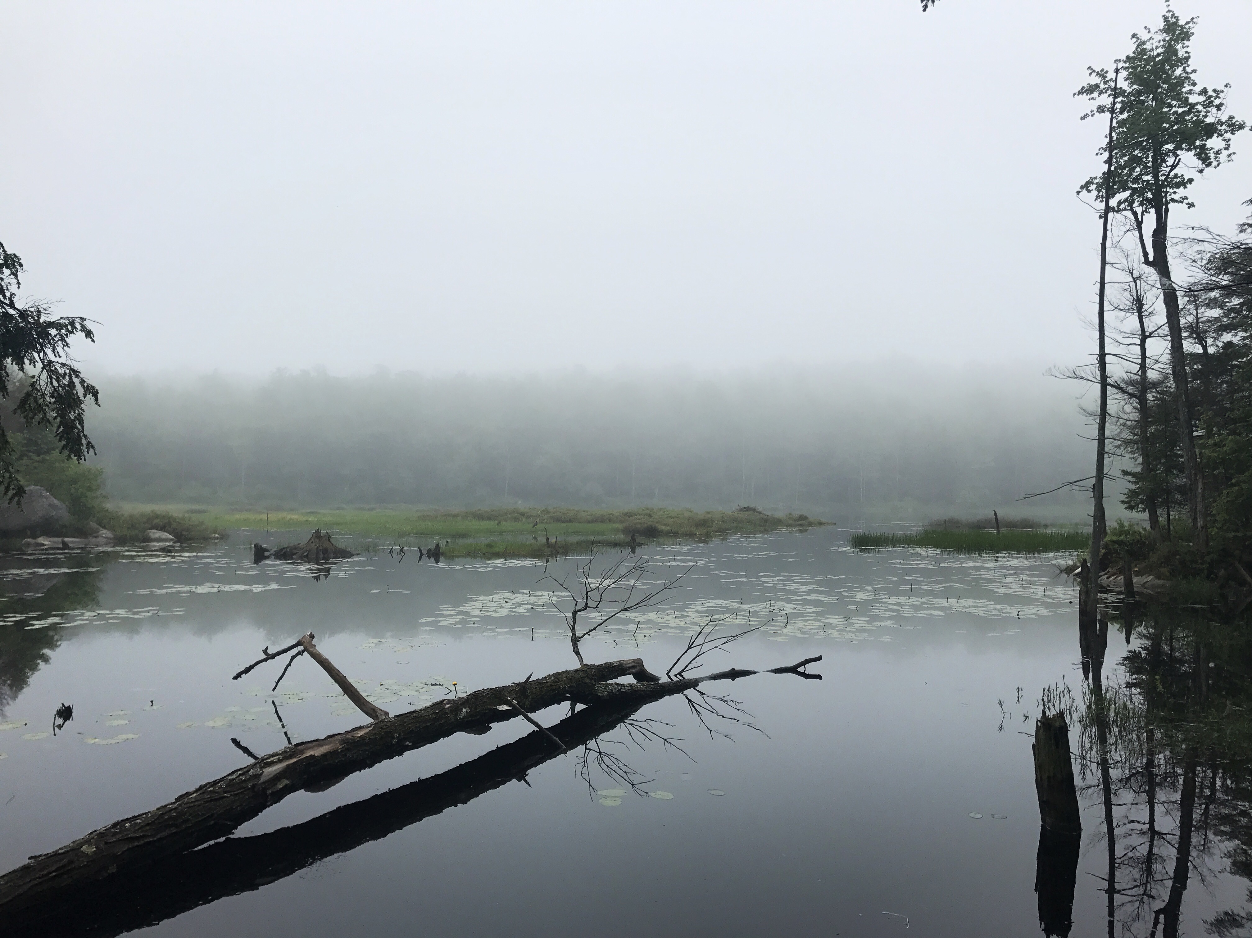 The trail climbed for a bit and then flattened out, eventually leading us to a pond. As we approached the water, I started to get grumpy about what I assumed was coming: slick roots and bugs. Those things existed, but we also got to see a beautiful, fog covered pond with a crane that cotton spotted because she was willing to walk closer to the edge to check out the view (top picture). Had I been alone, I might have grumbled and made my way around the pond as fast as possible. We stood and watched the crane while bullfrogs croaked behind us. Their calls sounded like someone plucking a guitar string that’s being slowly unwound. It felt good to be around someone who has energy for observation. It helped remind me of my goal to see the woods, and not just get from point a to point b.