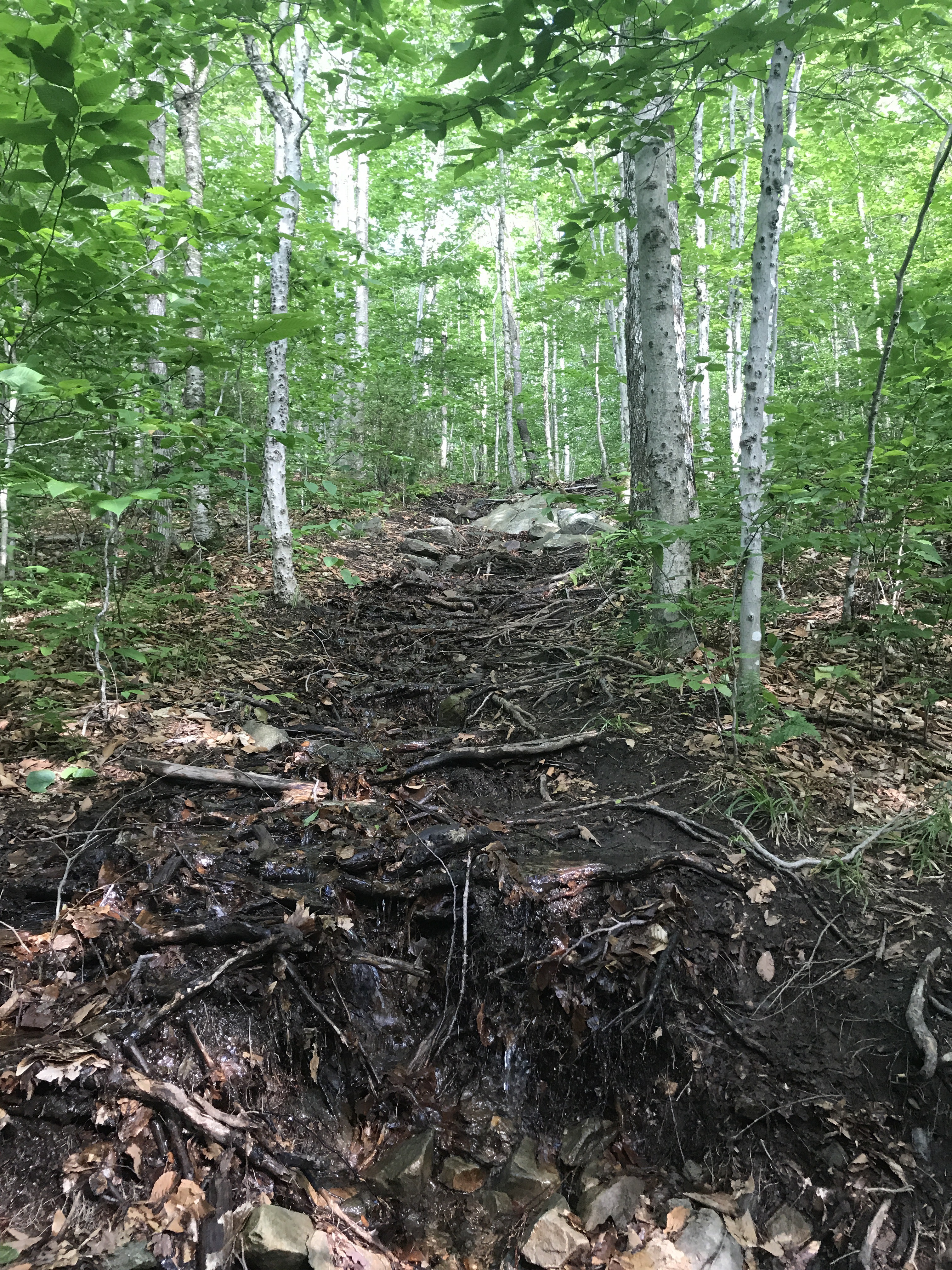The trail had mud with better structural integrity for much of today. However, after the first half mile, it turned into a root filled stream bed for about a half mile. It’s hard to find a balance between trying not to cause erosion while not hurting my feet jumping from rocks and not falling on my ass with the slippery roots. Then there was a beautiful dry section that lasted about half a mile after which I had to walk through a downhill stream where the best I could do was try not to step in actively following water. Sometimes the seemingly solid steps turn out to be ankle soakers, but I poked and prodded the mud with my hiking poles in vain hoping to make good choices.