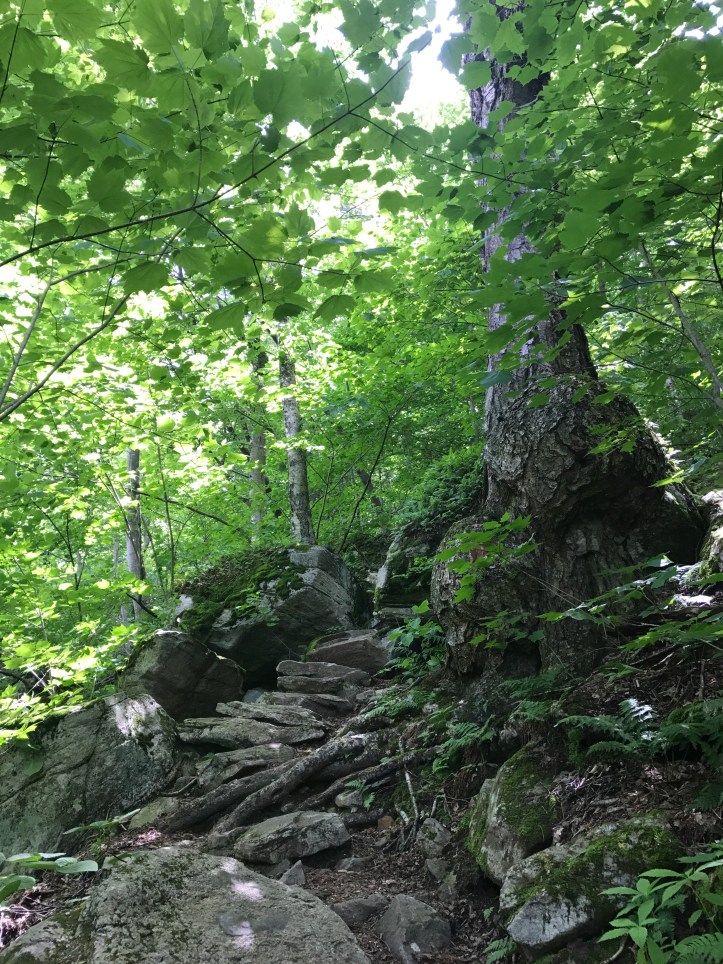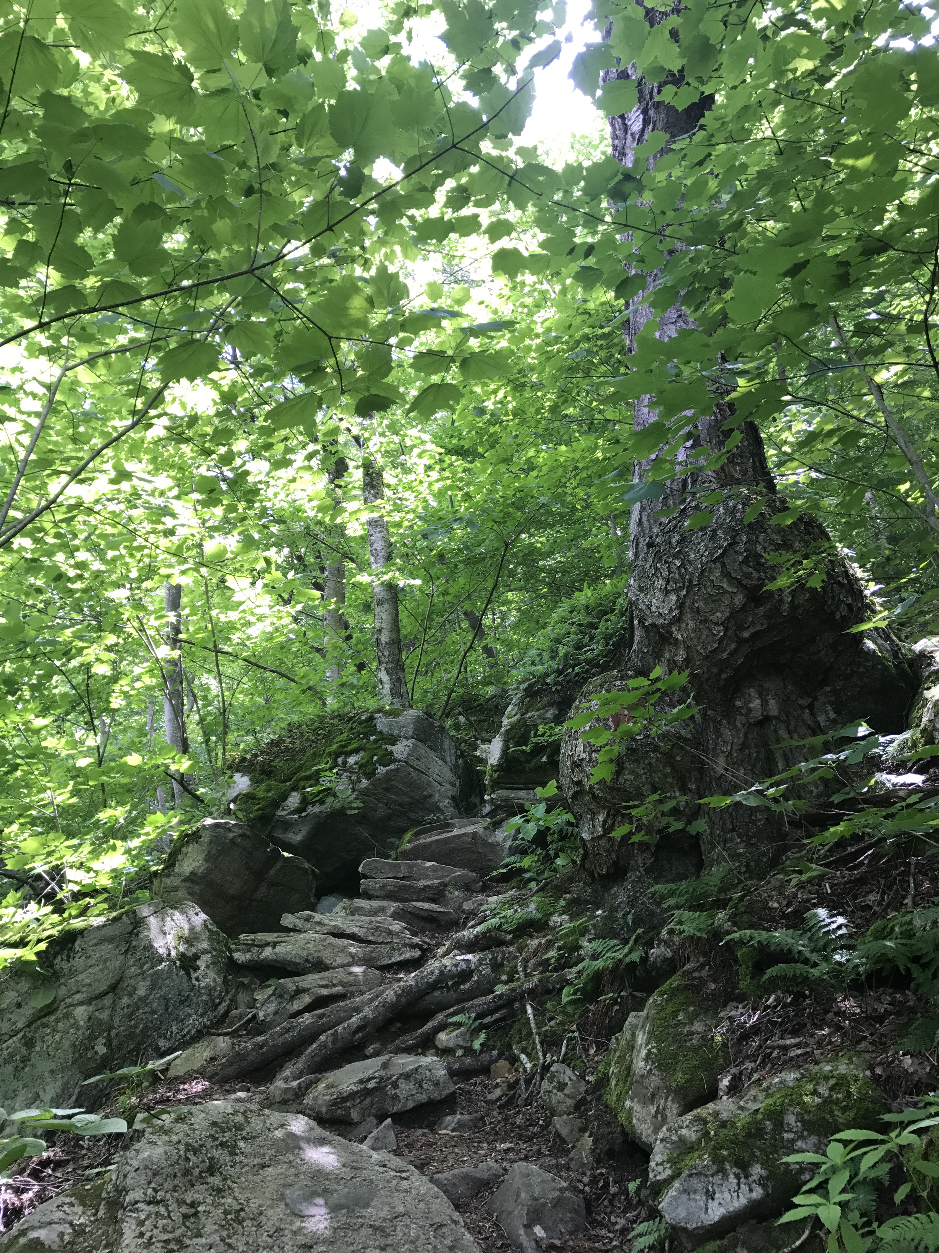 Around 2, I took a break at an overlook with this picture window view through the trees. I had hoped to rest my feet and eat a snack, but a swarm of gnats hovered around me, darting at my eyes and ears. I had to move on almost immediately. I came to another overlook, but it was full of chatty hikers. Large groups of mid 20 somethings make my social anxiety kick up. I intended to pass by without stopping or speaking to them, but one of them called out a cheery hello, so I slowed down. Then another one asked me what was on my arm, which brought up the fun “guess what my tattoo is” game. One of them got it right away. Another one asked me if I needed food, to which i replied that I had too much food at the moment. Then I scurried away, tired of feeling 10 pairs of eyes on me. I wish I had stuck around to give them a chance, especially because I’m 90% sure one of them was queer. Alas, anxiety wins again.