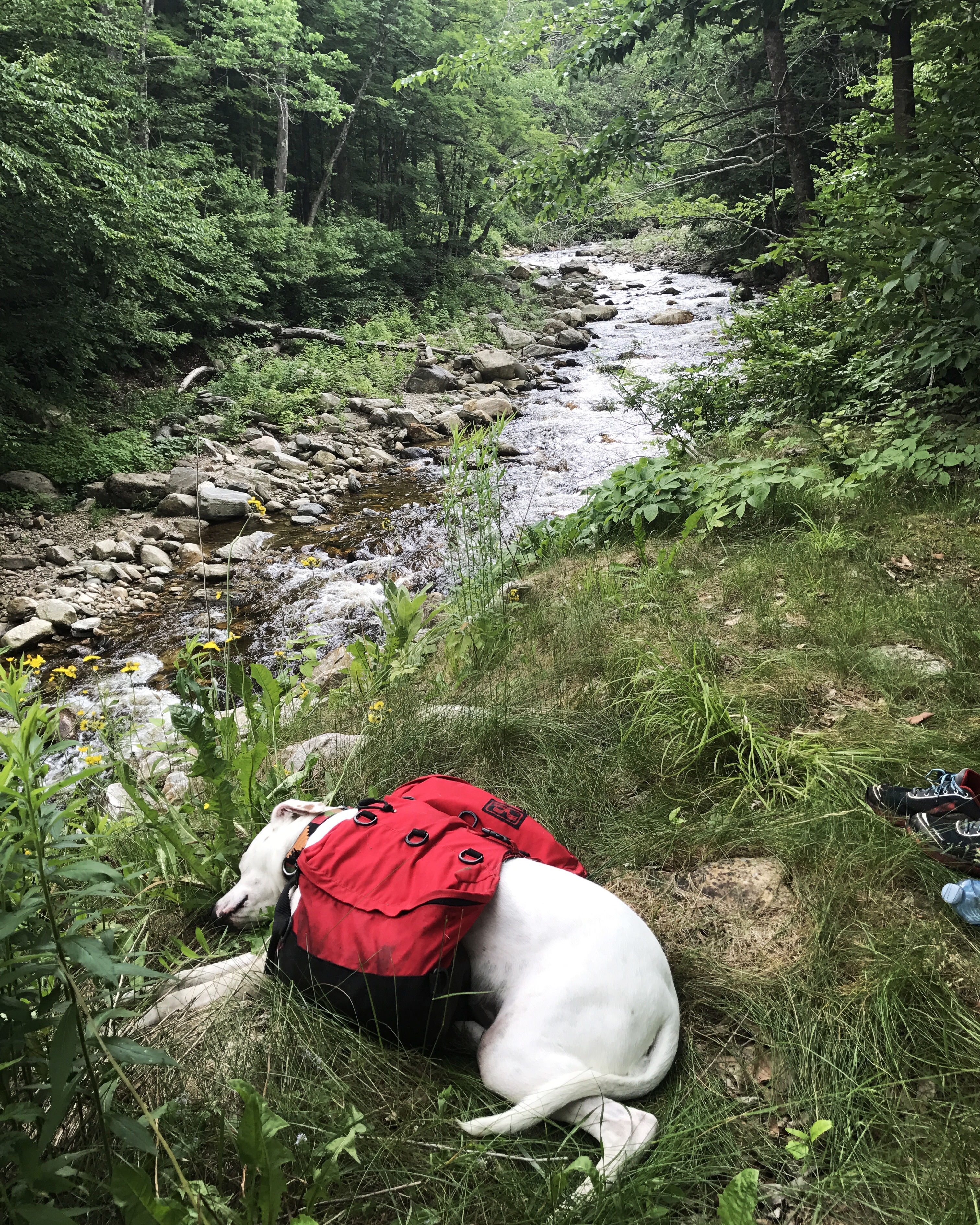 The trail remained mostly dry with small mud sections that weren’t as saturated, so they were easy to navigate. There was a long, rocky descent down to route 9. The boulders and steps were set far apart which involved a lot of large steps for short people. My knees and feet were pretty cranky by the time I reached the road, so I took a break in the sun by the stream with Ozzie and free.