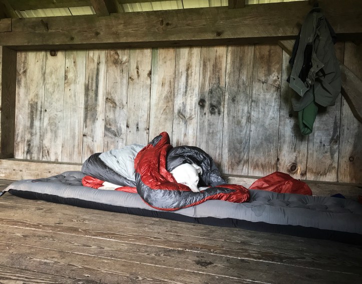 I dumped my bag, said hello to free and laughed and how pathetic Ozzie looked sacked out in the grass. Apparently he’s been shivering at night, so free tucked him into his sleeping bag while he cooked dinner. I ate a snack on the porch of the shelter and filtered 2 liters of water to get me through dinner, breakfast and to the next water source for tomorrow, which isn’t for several miles. Then I shouldered my even heavier pack and walked uphill for .3 more miles.