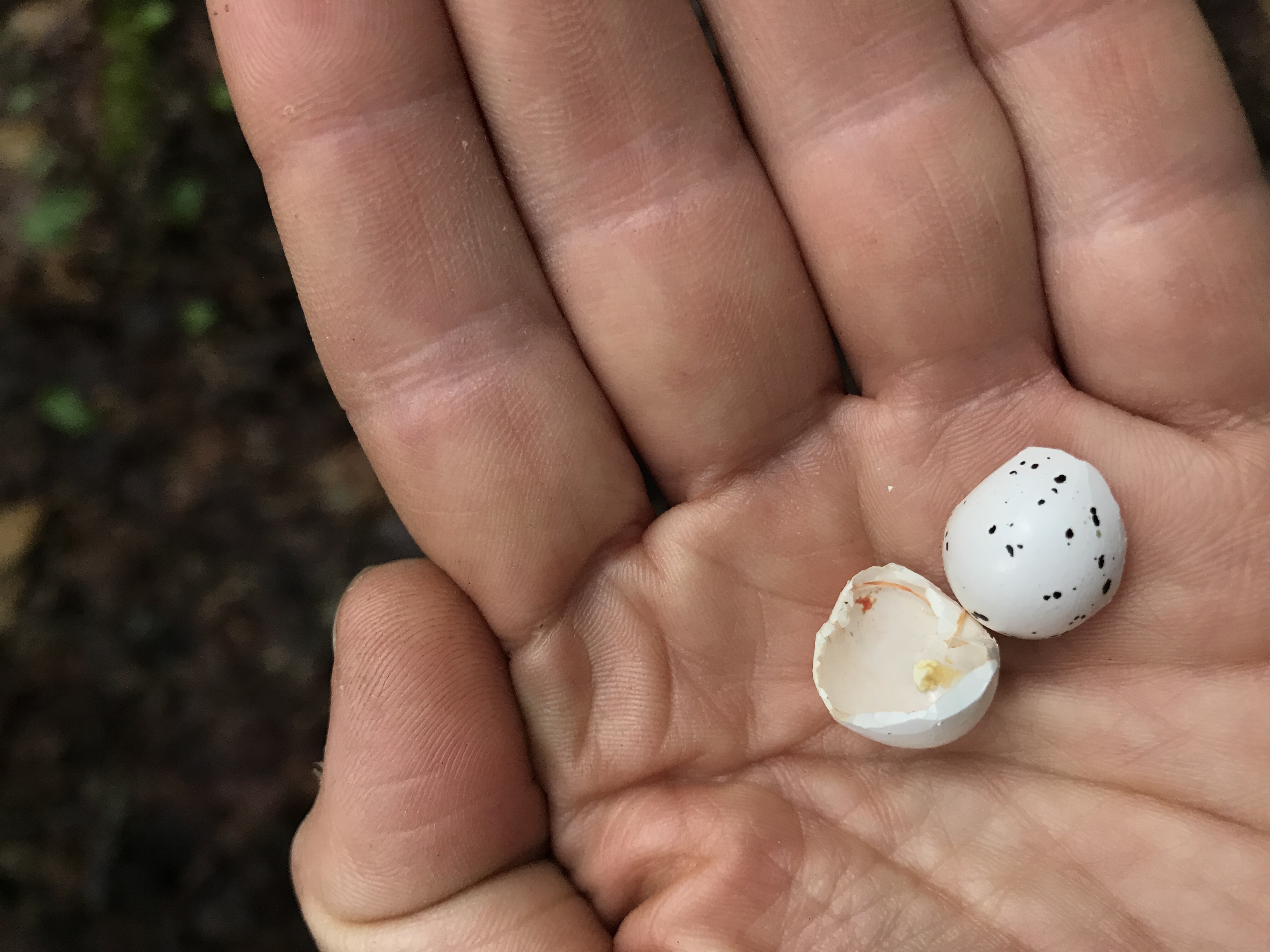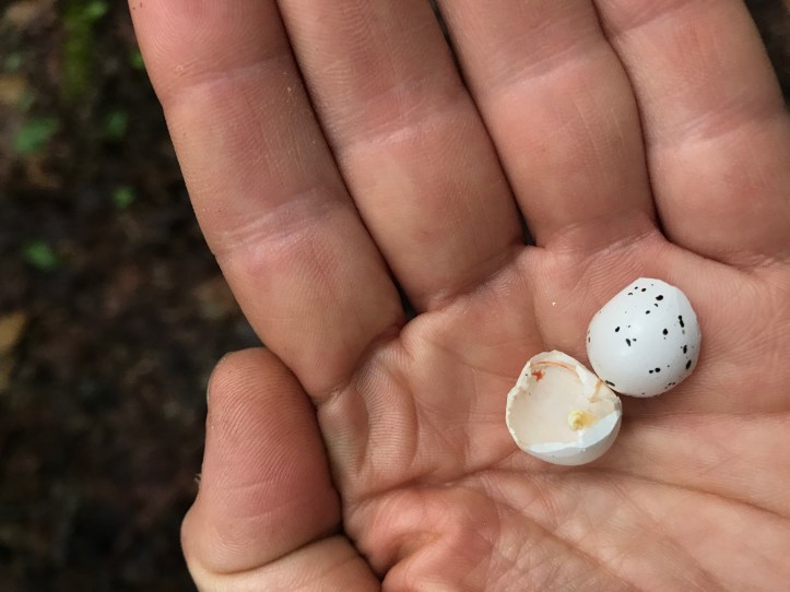 The trail eventually ran alongside an overgrown pasture with the mingling smells of blackberry blossoms and manure. I crossed a dirt road and entered your basic forest with rolling hills where I saw this tiny egg shell in the middle of the trail.
