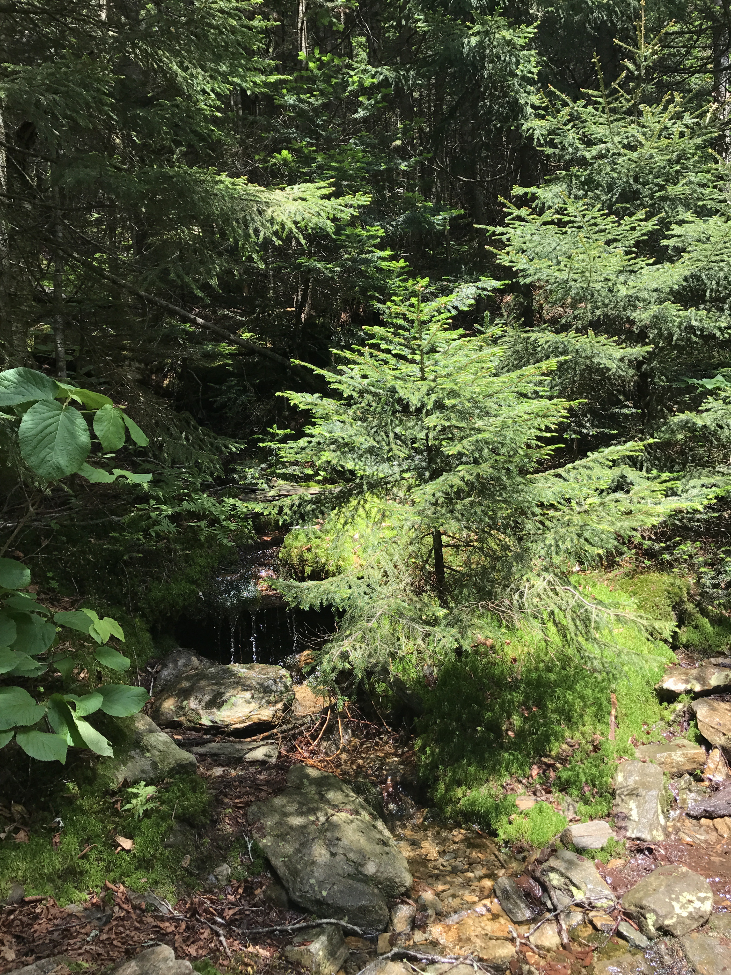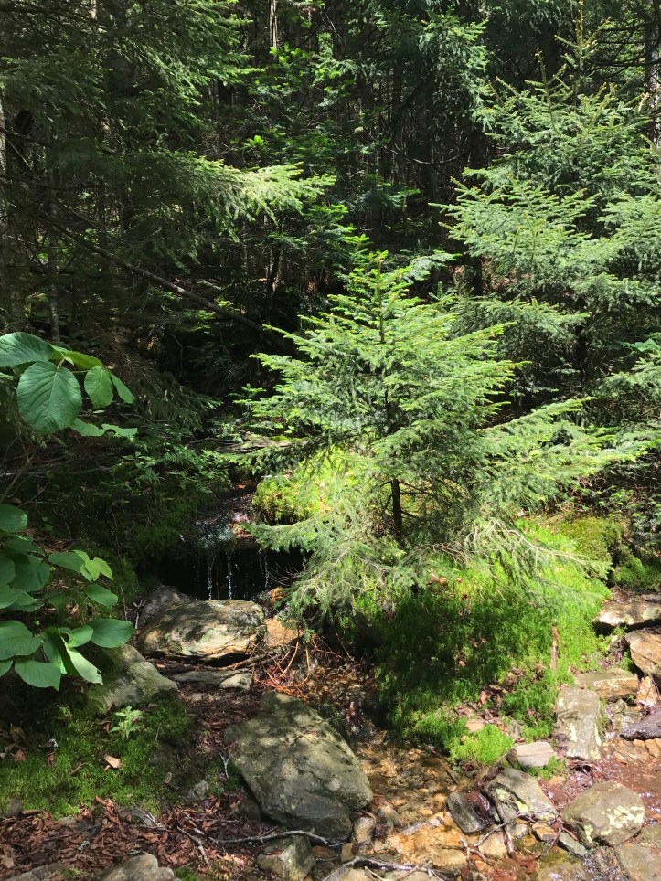 The trail climbed parallel to a brook through soft pine needles that transitioned to a rocky, wet area. I could hear the water in the distance for quite a ways. Then the trail turned back towards the stream, which I mistakenly thought was an incoming rain shower because it was so loud. I wound through dark forest until I hit another road crossing that thrust me back into sunlight for thirty seconds and then back into the woods with heavy canopy that blocked most of the light.