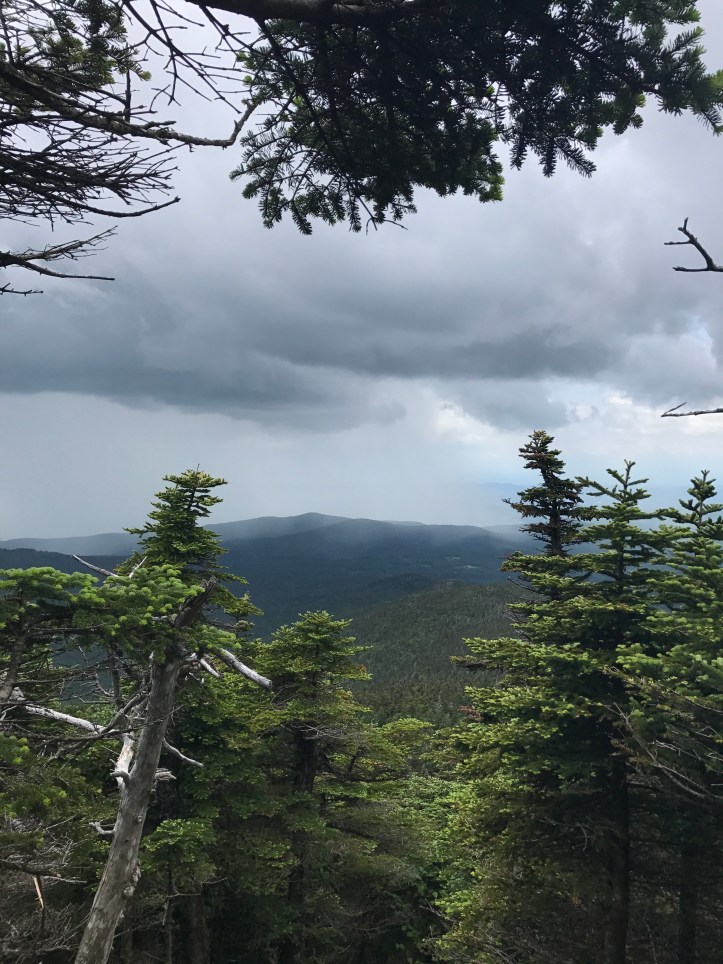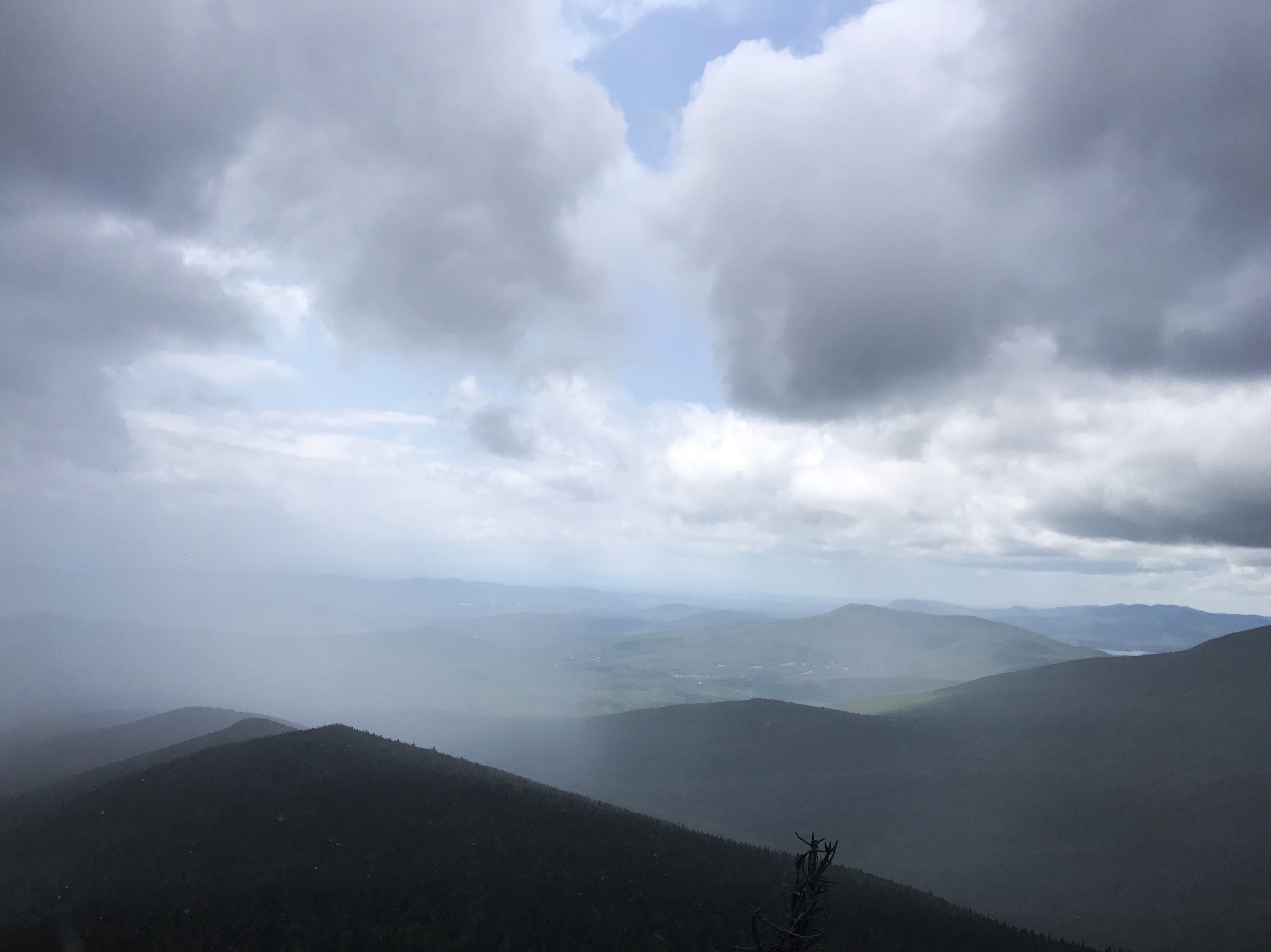 The trail was flat for longer than I expected, but it eventually resumed climbing. I reached Cooper lodge shelter and ran into zebra coming down from the blue blaze trail from the summit. The AT doesn’t actually go to the summit, but a steep side trail does. I asked her if she could see anything, and she said yes, but there was also rain. I took a break on the wooden tent pad and ate a snack while considering my options. I didn’t want to stop short of the summit because when will I be back here? but I also wanted to be able to finish my day and not wreck myself. In the end, I couldn’t pass it up.
