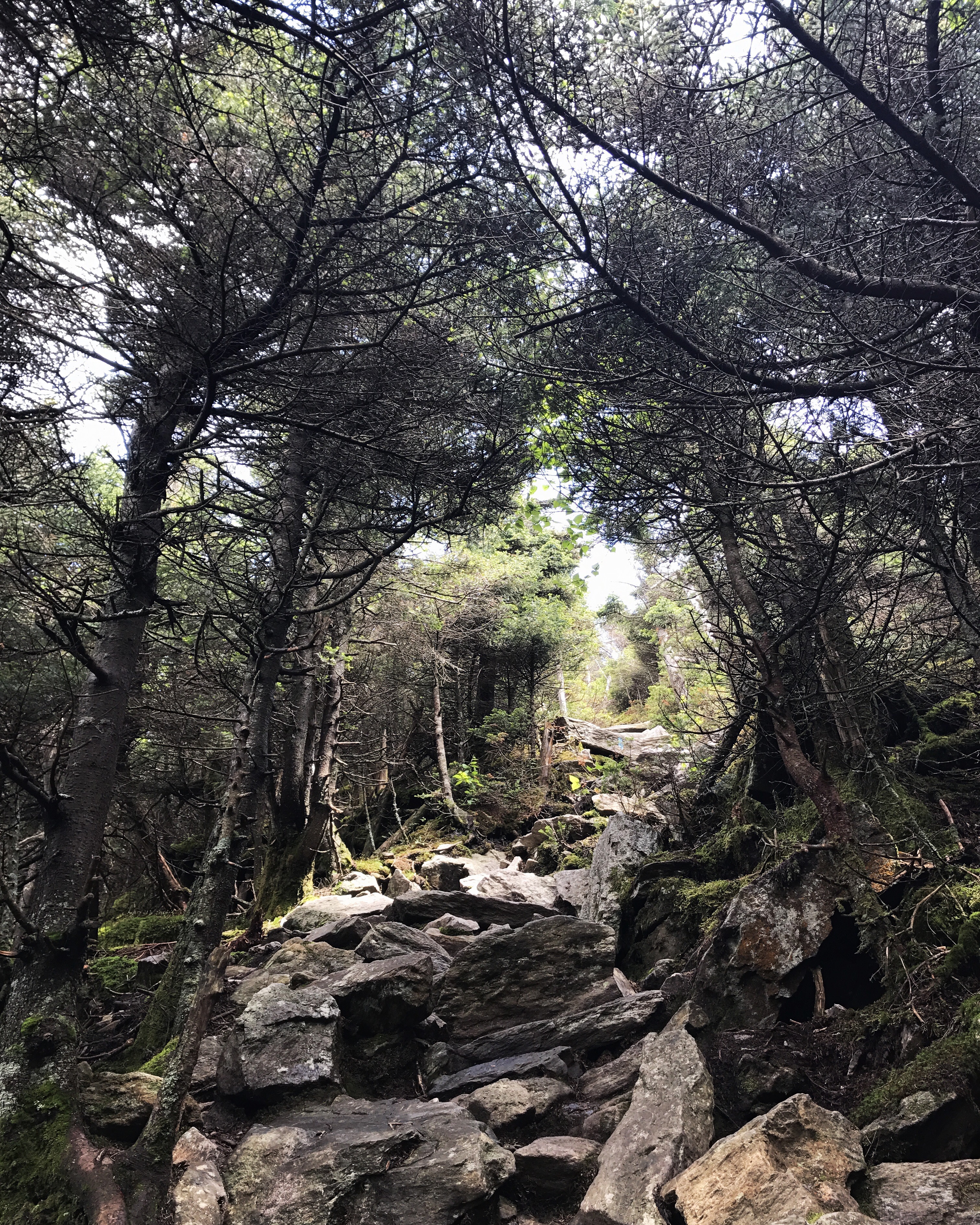 I felt a sense of urgency for awhile because the sky had darkened and the wind picked up, but no rain ever came. As the sun re-emerged, I finally slowed down to pay more attention to my foot placement. My feet were starting to get sore and there were a lot of things to navigate on the path. The woods were incredibly green, full of ferns, lilies, moss covering much of the flat surfaces. Eventually a type of grass also entered the scene, which I wasn’t expecting.