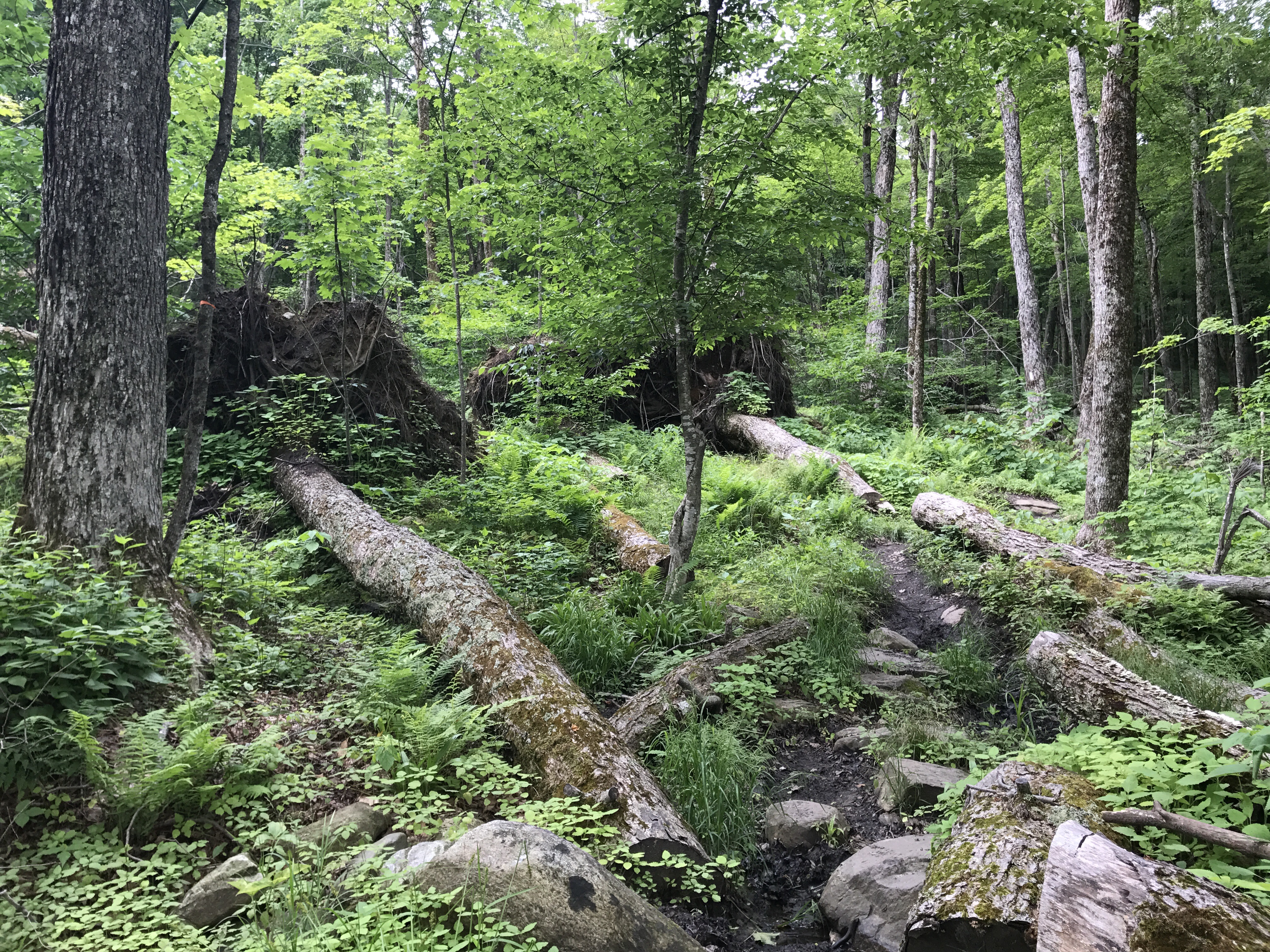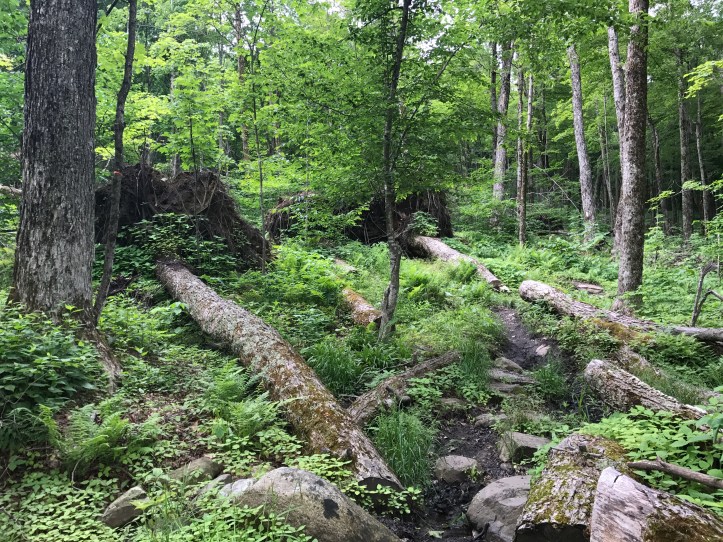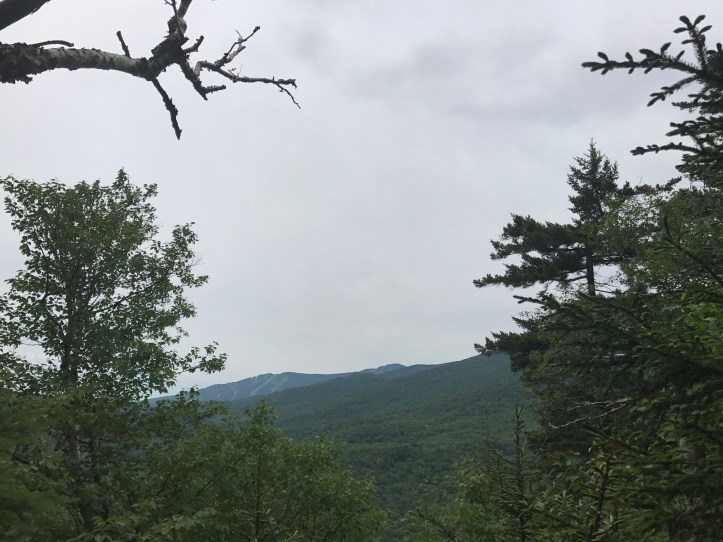 I left a little after 8, and began the descent into Killington. As the trail flattened out, I went through an area with numerous downed trees. Giant root beds tilted to the sky with collections of stones tangled in the network of roots. The trail began to climb again, which I hadn’t expected because I didn’t look closely at the elevation map for today. The humidity made it hard to breathe, and I found myself chuffing my way up the hills. As I walked, I heard industrial noises off to my left. I couldn’t tell if it was road noise or a business. My tolerance for these noises has grown on my thru hike. It’s different than a weekend hike where my goal is to pretend like the mechanical world doesn’t exist, and I only have 4-6 hours to find that peace. I still don’t enjoy it now, but there are many other hours in many other days that could be completely free of man made noises. The stakes are lower.