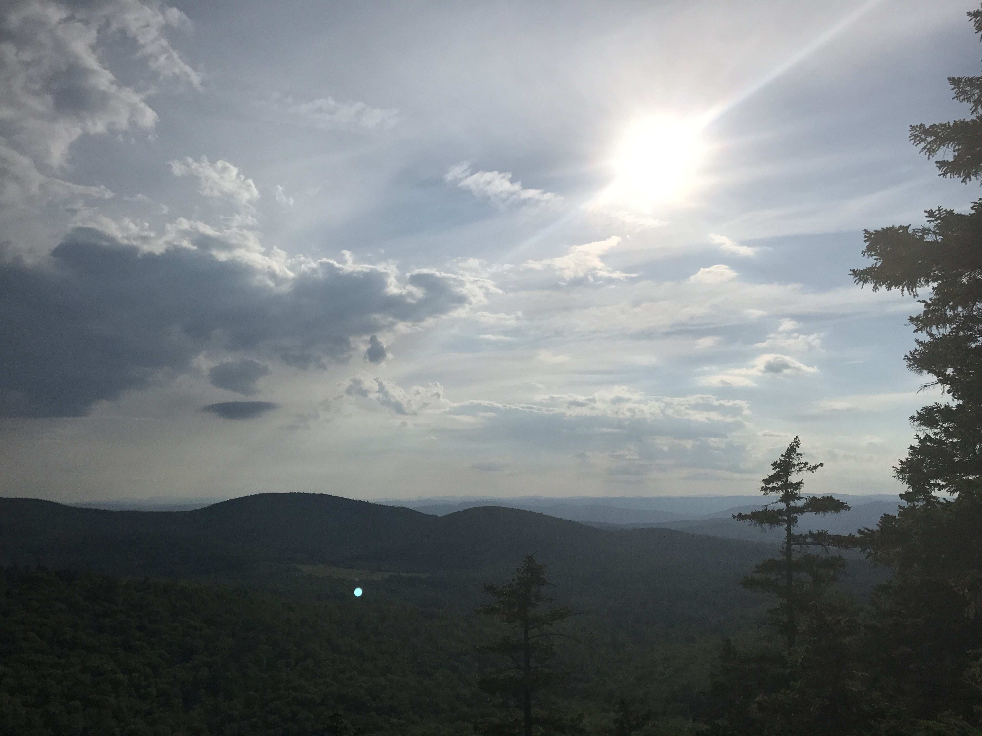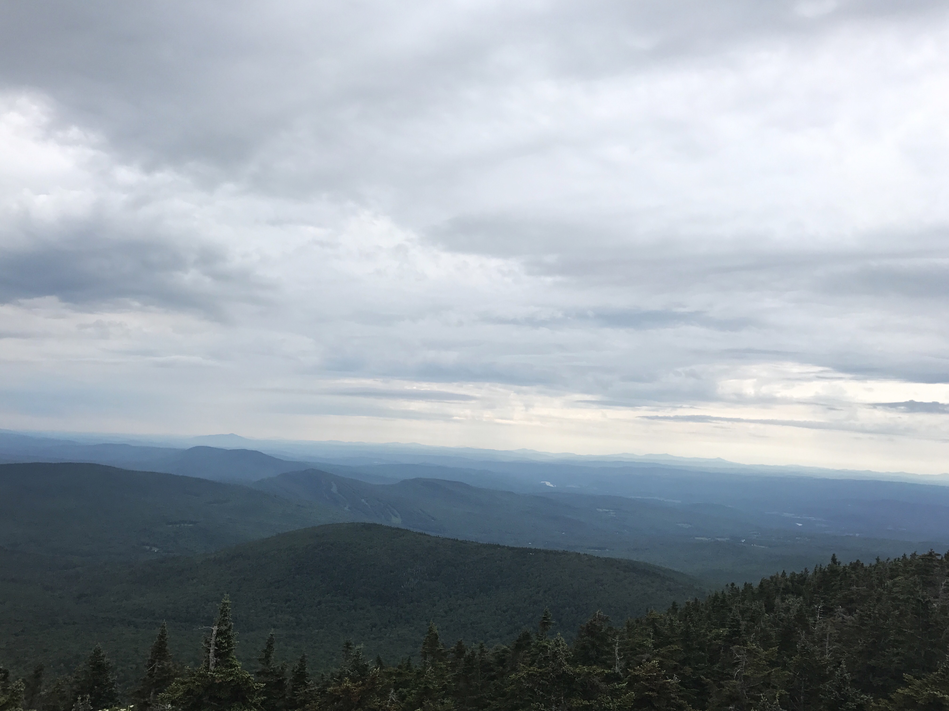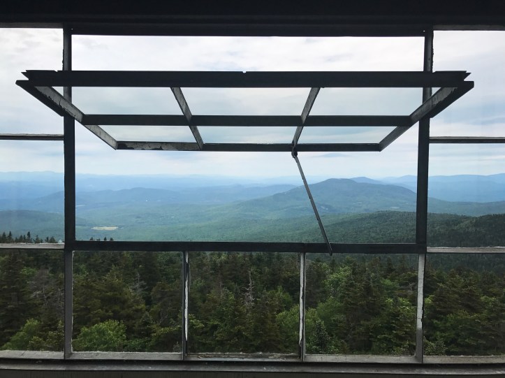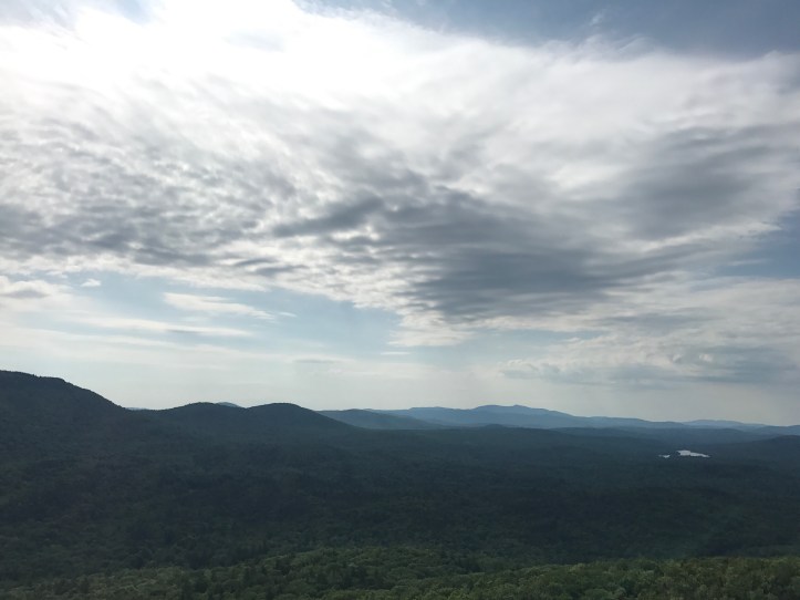 I passed a couple of section hikers on their way down and asked about the terrain on the other side of mountain. I couldn’t keep going if it involved going down something as steep as this. The guy said it was much a more gradual descent with actual trail. I calculated that into my plans and kept going. Around every corner I hoped to see the trail flatten out, but it just kept winding up and out of sight. After another 40 minutes, I finally got the fire tower. I went straight up so I wouldn’t have to walk down the stairs with post-break cold legs. The views were incredible (top picture, along with this):