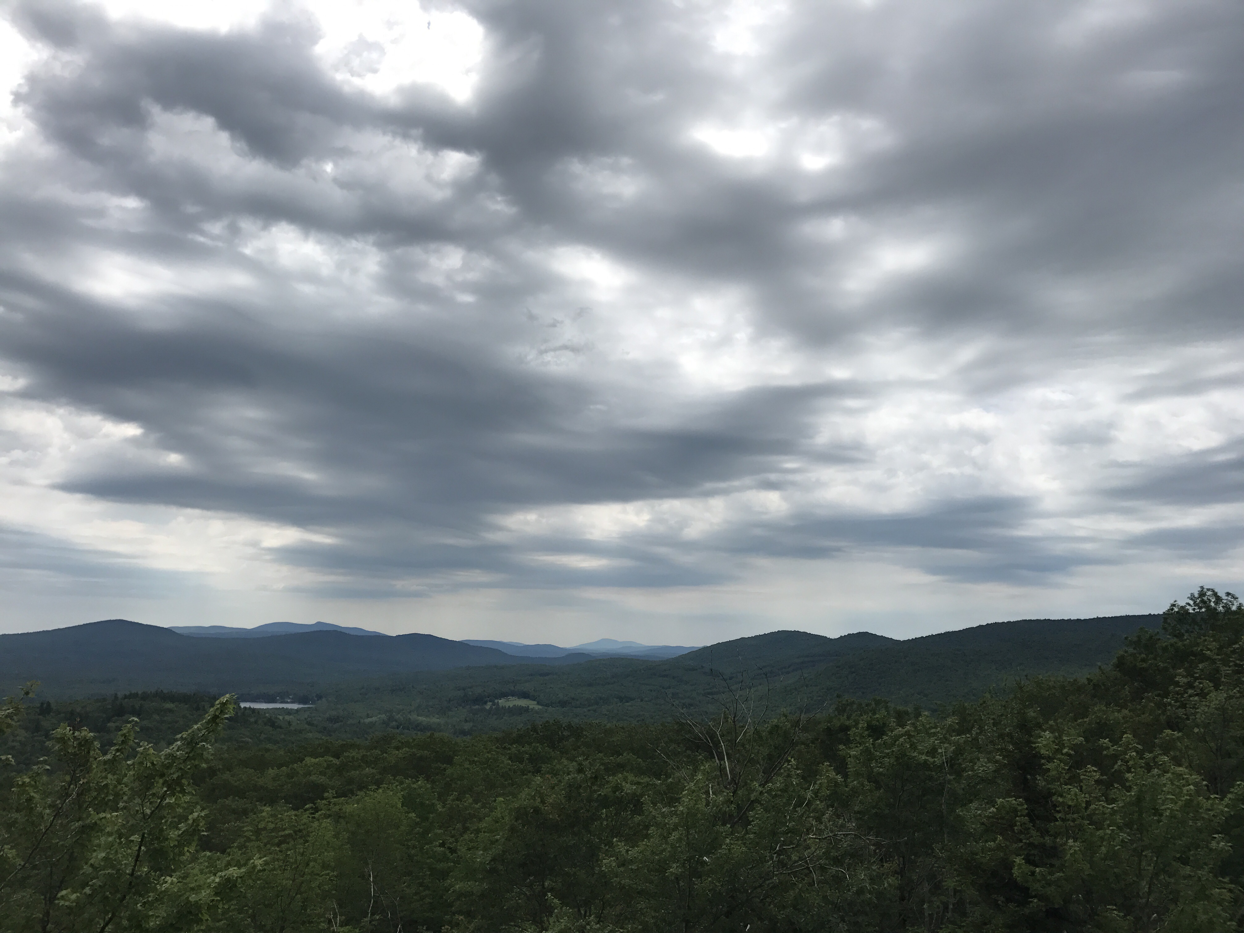 I was ready around the same time as influx and pretzel. I asked pretzel to say hi to halfway if she runs into him. I’m not sure I can make their miles today because they intend to go a “short” 17.7 to a shelter called the hexacube. I will reassess when I get to the 12.4 miles stopping option on top of smarts mountain. As I left camp, who did I see standing together but Lewis and Clark! I had been confused and disappointed when i didn’t see them last night, but they were in their tents the whole time (they sleep in separate tents which they’ve joked is why they can hike together). I had accidentally interrupted their praying, so I waited until they were done. When they turned to leave, Lewis was surprised and happy to see me. She talked a mile a minute as we walked together for the next 90 minutes. Then Clark needed water and I didn’t want to stop, so I kept walking. Our paces are similar, but I figured it would be nice to have a social break and turn on music to help push through the dull terrain. Not much to see this morning. Although at a road crossing, I did see a sign that said “bears with tracking collars, don’t shoot them.” That doesn’t bode well on so many levels. Shortly after the sign, the trail went through a flat pine area then began the climb. The neverending climb. I had hoped to take a break at the top with a view, but I couldn’t wait. I stopped at a decent rock to rest my feet and stuff my face. About 30 minutes later, I got to an actual viewpoint and had another snack with these mountains in the distance.