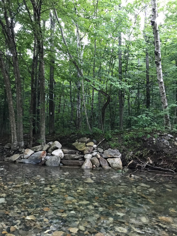 Shortly before the shelter, we came to a water source where I filled my sawyer bag to get it out of the way. We finally hit the turn off as the light faded. We had to take our headlamps out to survey the campsite for tenting spots. Nearly everyone was in their tents already, and I felt inconsolably tired and hungry. We picked out two mediocre spots in front of the shelter. I hoped for a dry night as I pitched my tent with little care for anything but keeping it upright. Then I grabbed my food bag and bug spray and sat at the bear box in the center of camp and ate what I hoped amounted to a decent number of calories. It’s so hard to stop eating when I get to that point of hunger, and I didn’t have the energy to try to count the calories. I brushed my teeth without getting up. Walden tried to talk a bit, but I felt self conscious about being loud while everyone slept and I had lost all ability to be human so I had trouble engaging. Then I tossed my food bag in the bear box, peed a little away from my tent and crawled inside to push through the rest of my bed setup. I felt grimy and exhausted and amazed that we had actually made it. I’m finishing this to the sound of a loud brook to my right, and what I think is floater in her tent snoring. My legs are aching. I hope my knees can make it through the whites. No more 17 mile days for me if I can help it.