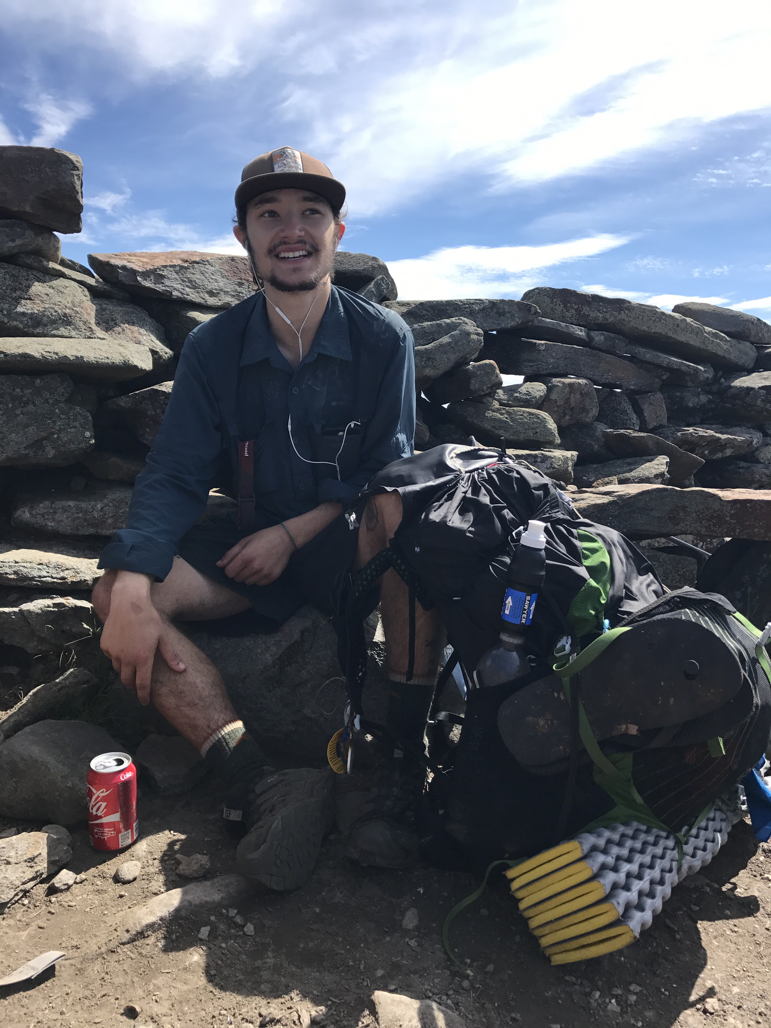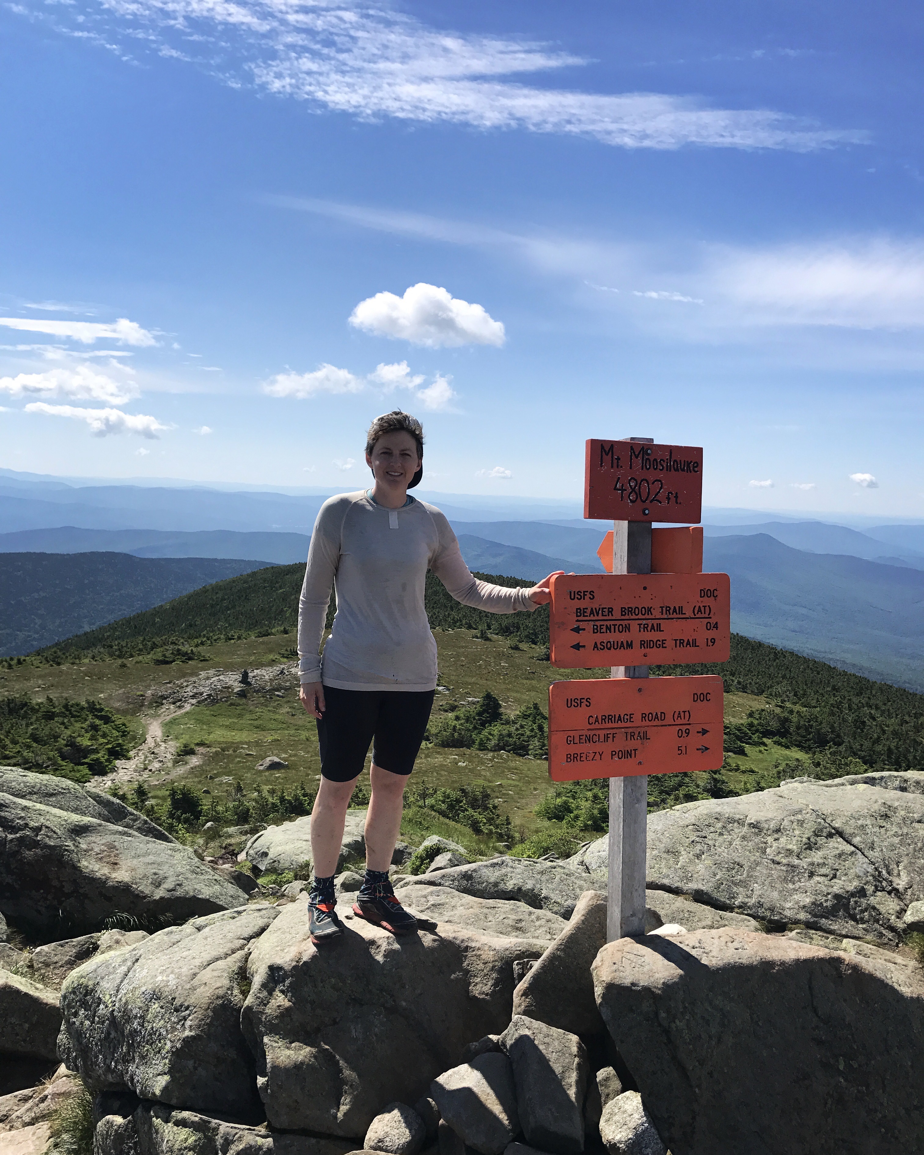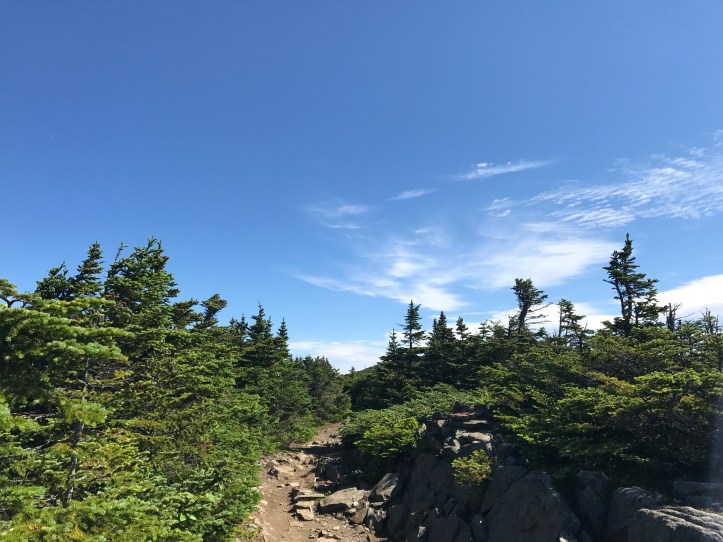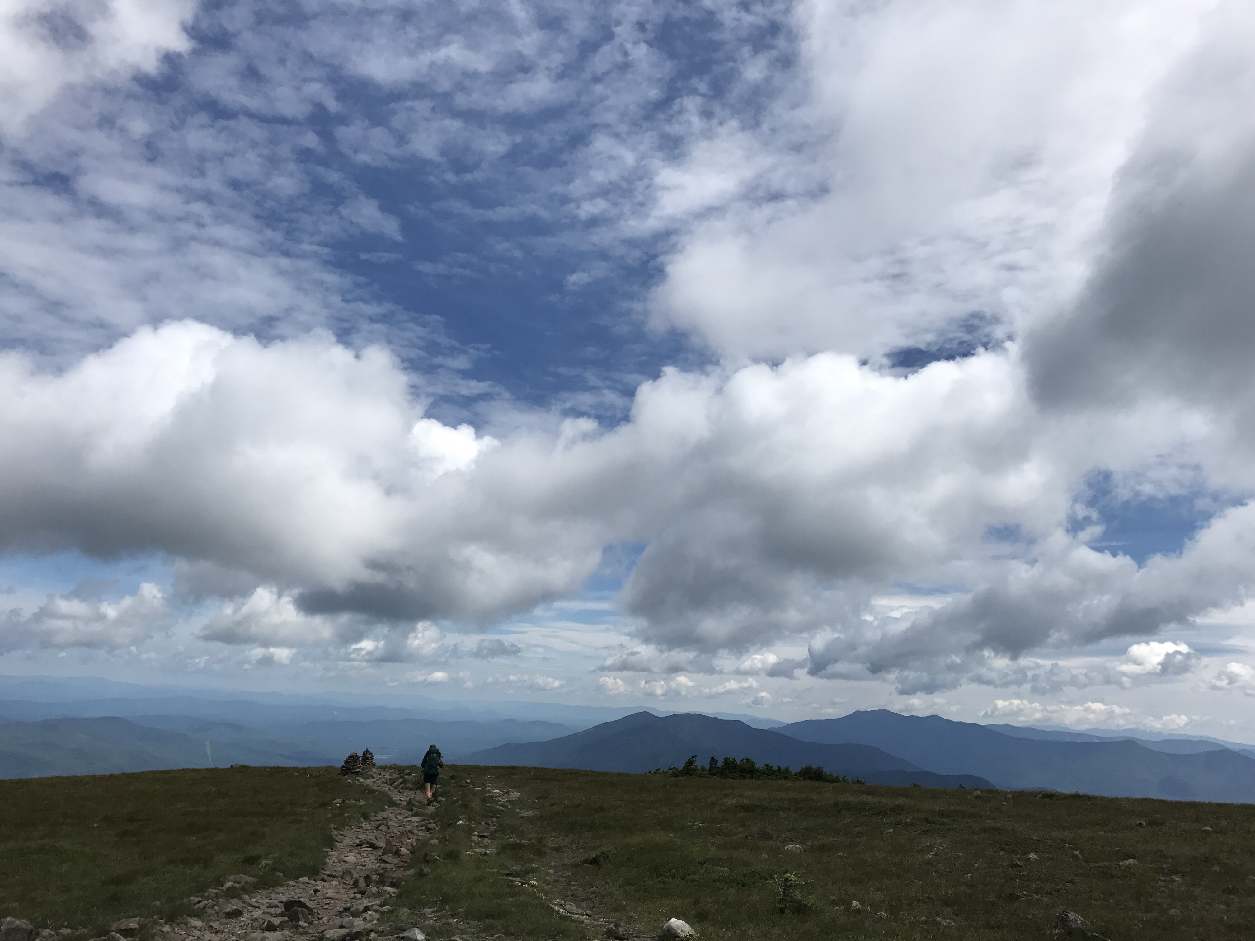Seeing the peak out in front of me felt so different from the myopic view of the rocky, green tunnel I’ve been in for so many miles/days. The shapes of people walking along the trail shed some perspective on the distance between me and the summit. the wind picked up as the trees grew smaller and I had to add my wool layer. The wind at the summit made it hard to keep my balance as I walked over to the sign I’ve seen so many times on social media. I took a picture even though it was kind of backlit.